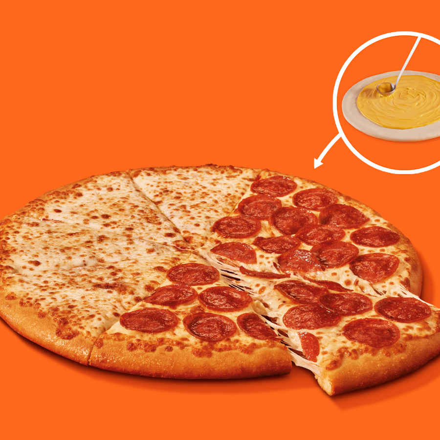 Pizza grande mitad extra pepperoni, mitad extra queso con una base de salsa sabor queso cheddar