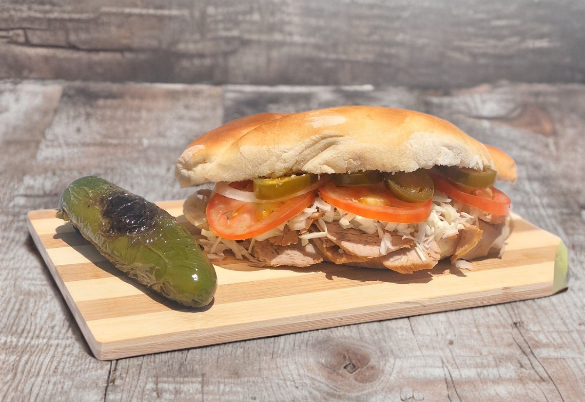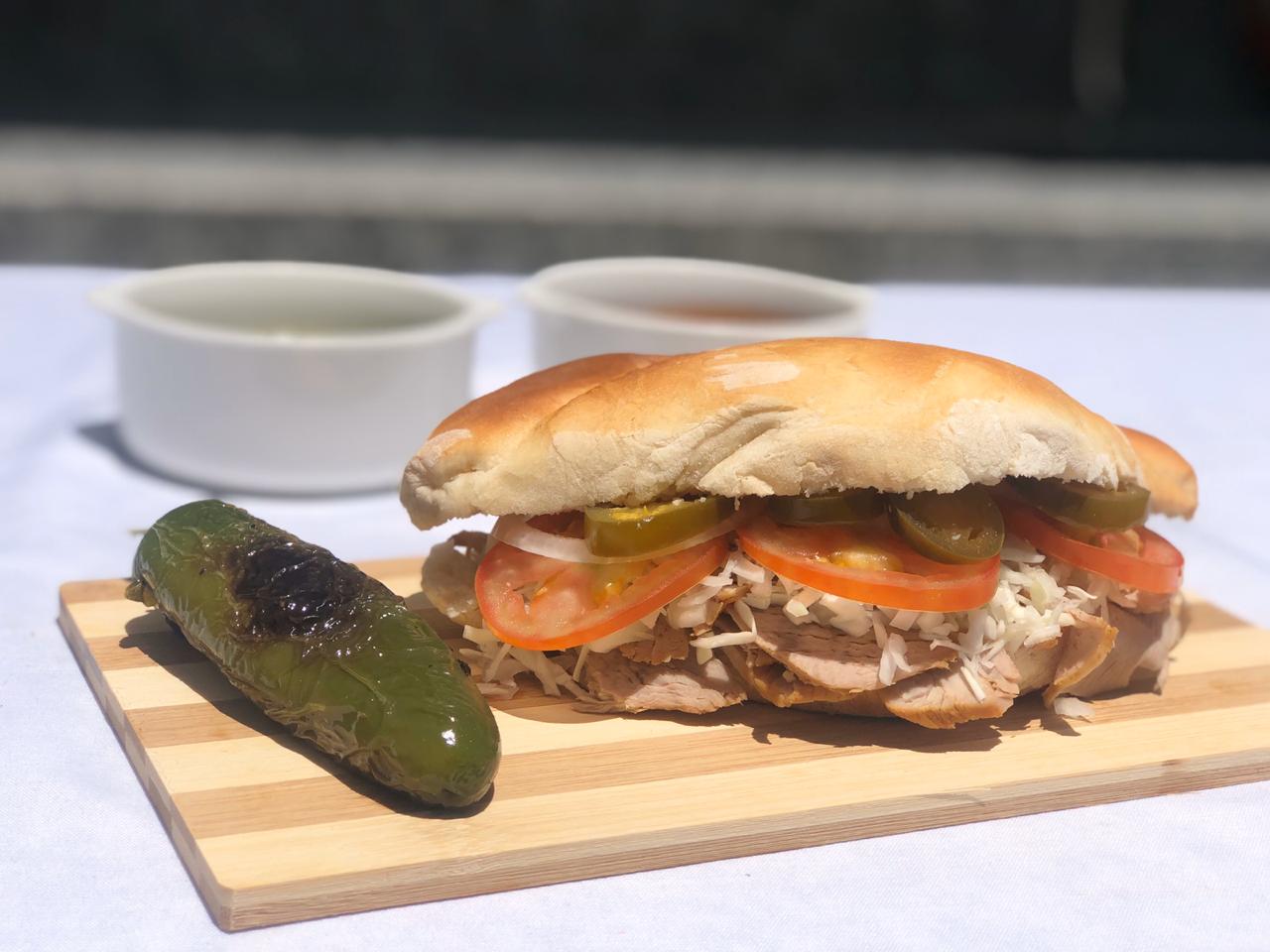 Lonche con carnitas, mayonesa, mostaza, tomate, repollo, cebolla, chile