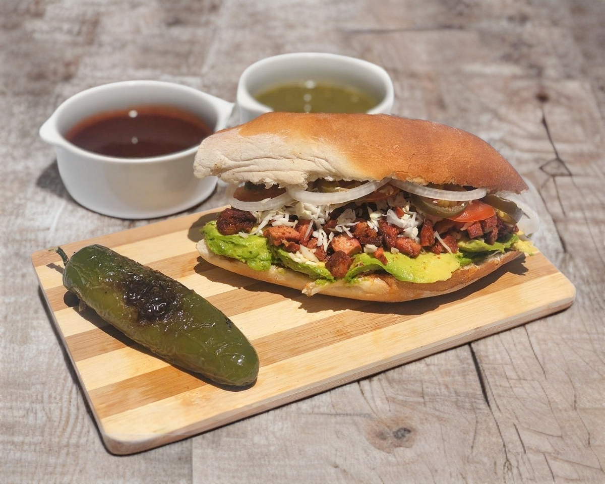 Lonche con carne de trompo, aguacate, cilantro y cebolla