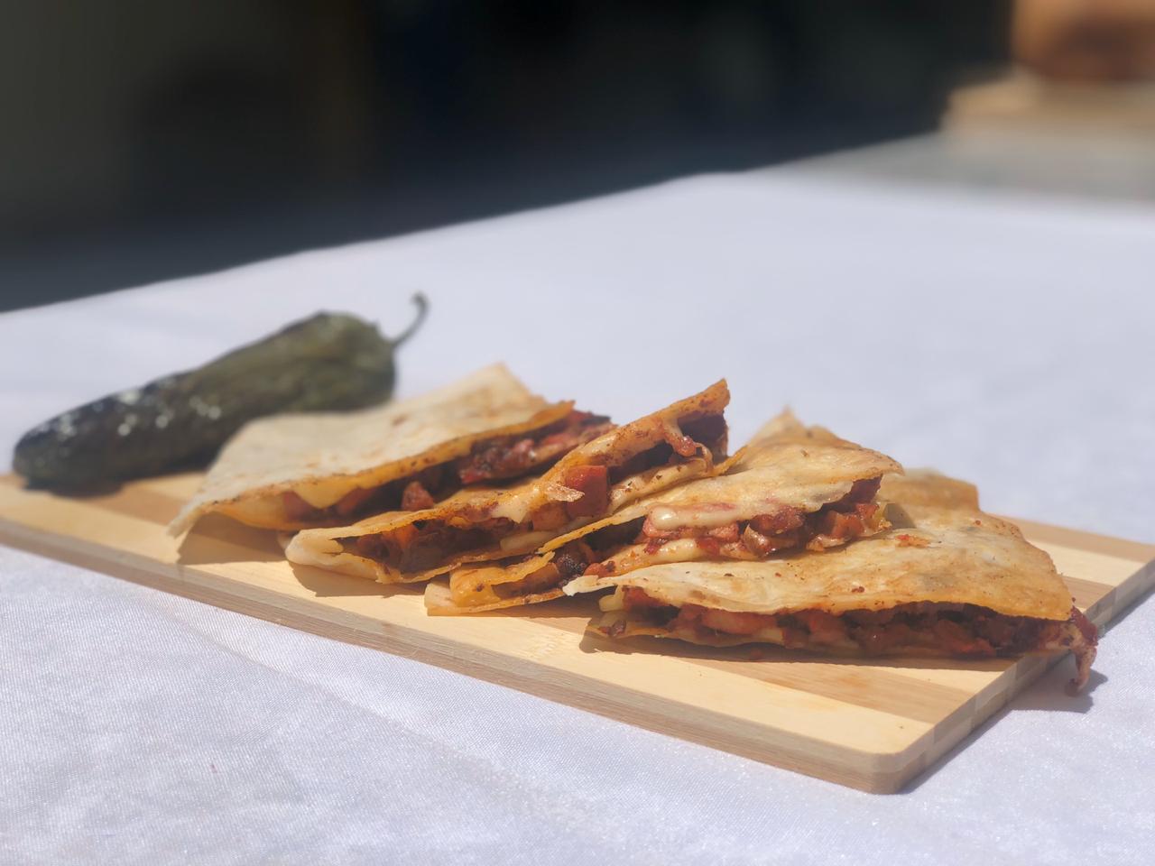 4 tacos con doble tortilla con carne de adobada cilantro cebolla