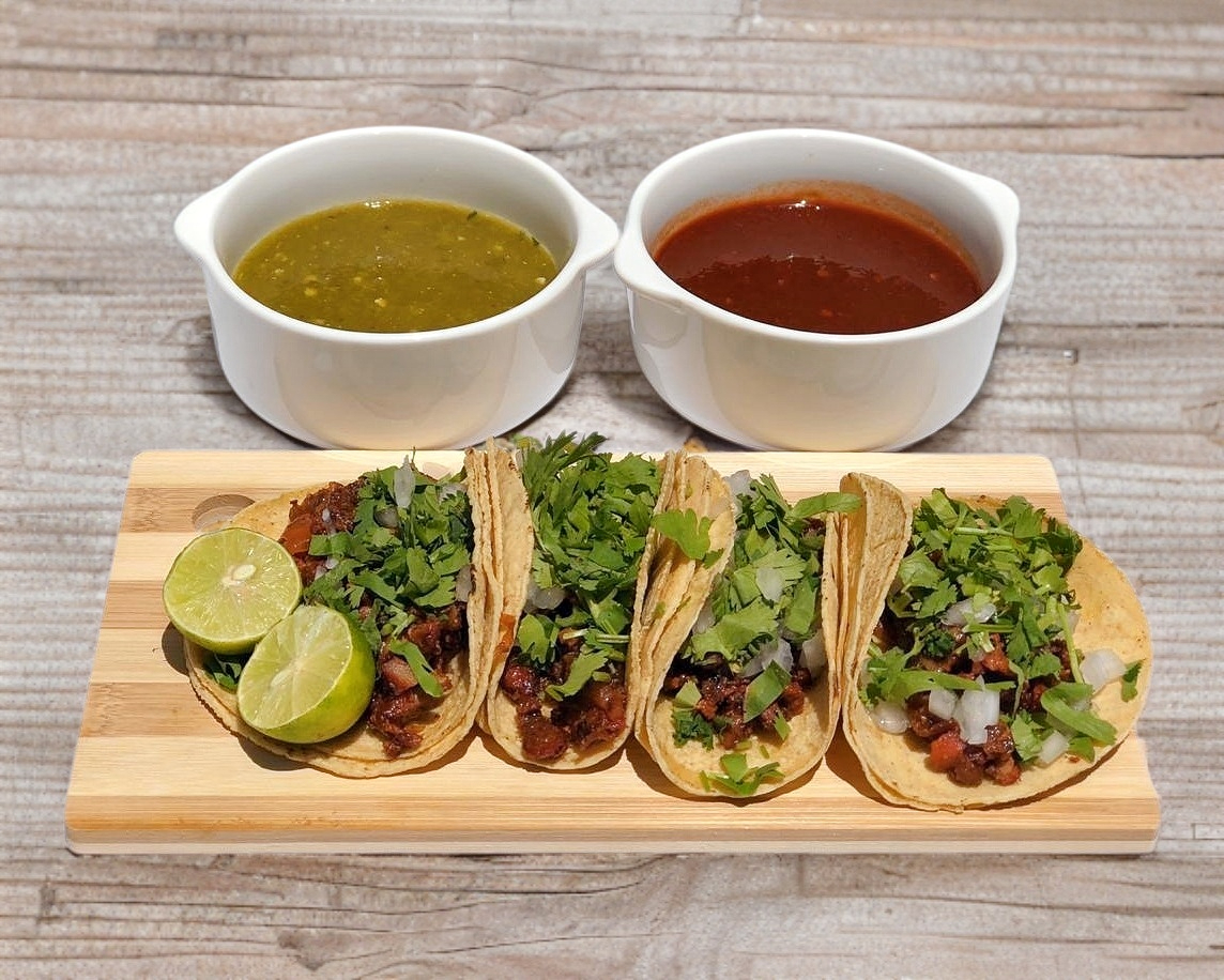 4 tacos en doble tortilla de maíz con carne al pastor, cilantro cebolla