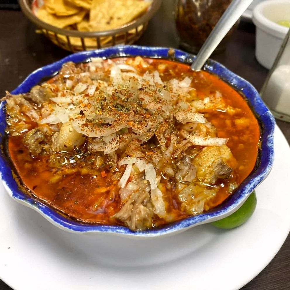 Nuestra especialidad con la receta tradicional desde 1971. Disfruta de este delicioso pozole rojo preparado con cabeza de cerdo y maíz. Acompañado con sus tradicionales guarniciones: cebolla picada, orégano, chile de árbol y limón