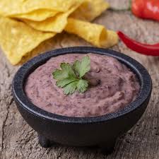 Frijoles refritos, acompañados con totopos y salsa