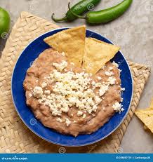 Frijoles refritos con queso, acompañados con totopos y salsa