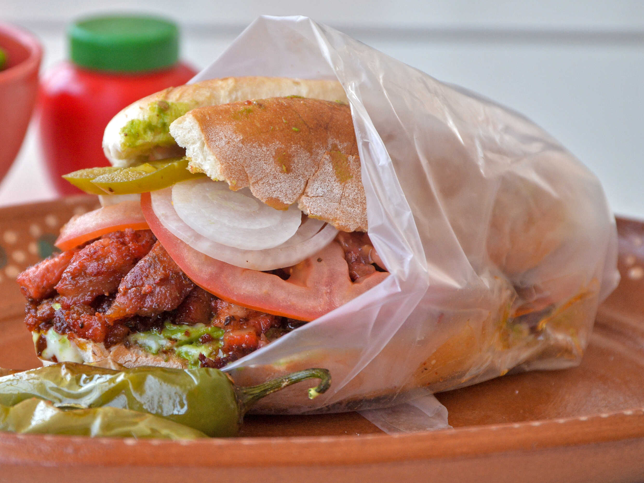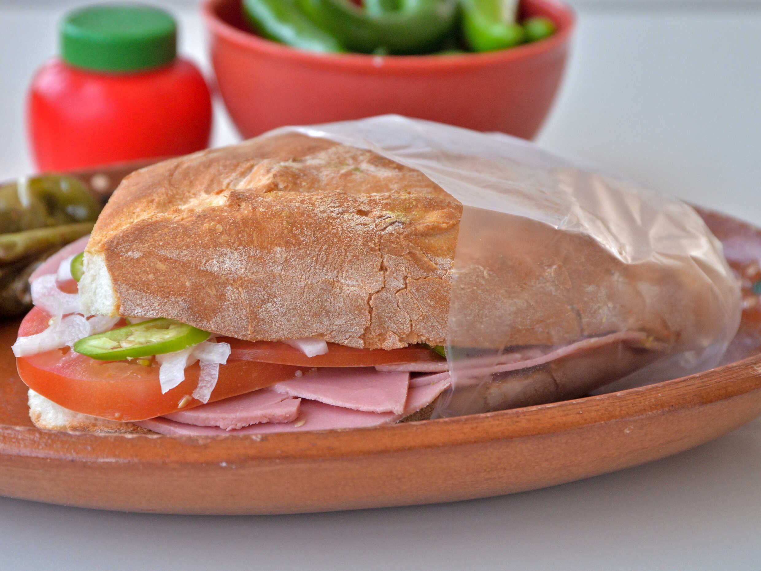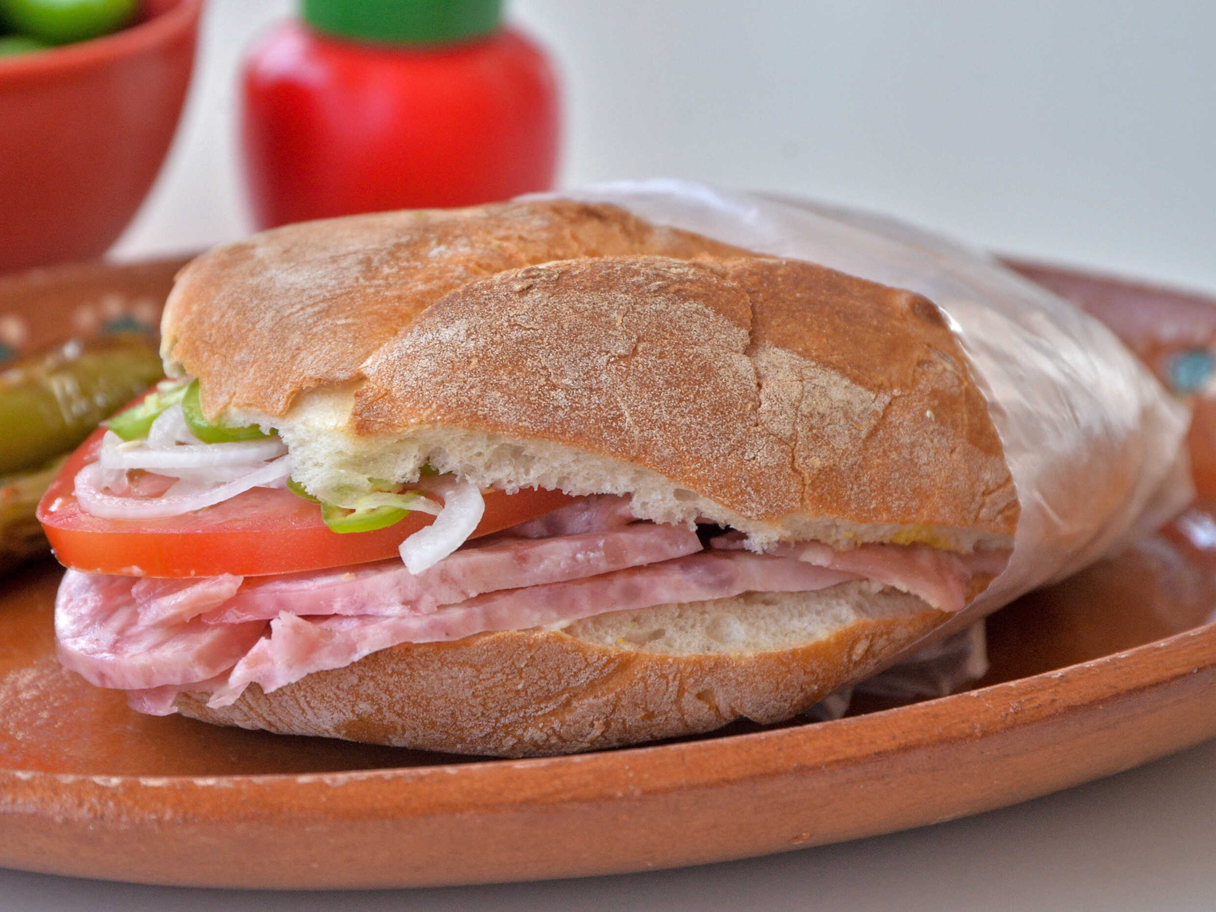 Jamón, mayonesa, mostaza, tómate, cebolla y chile jalapeño.
