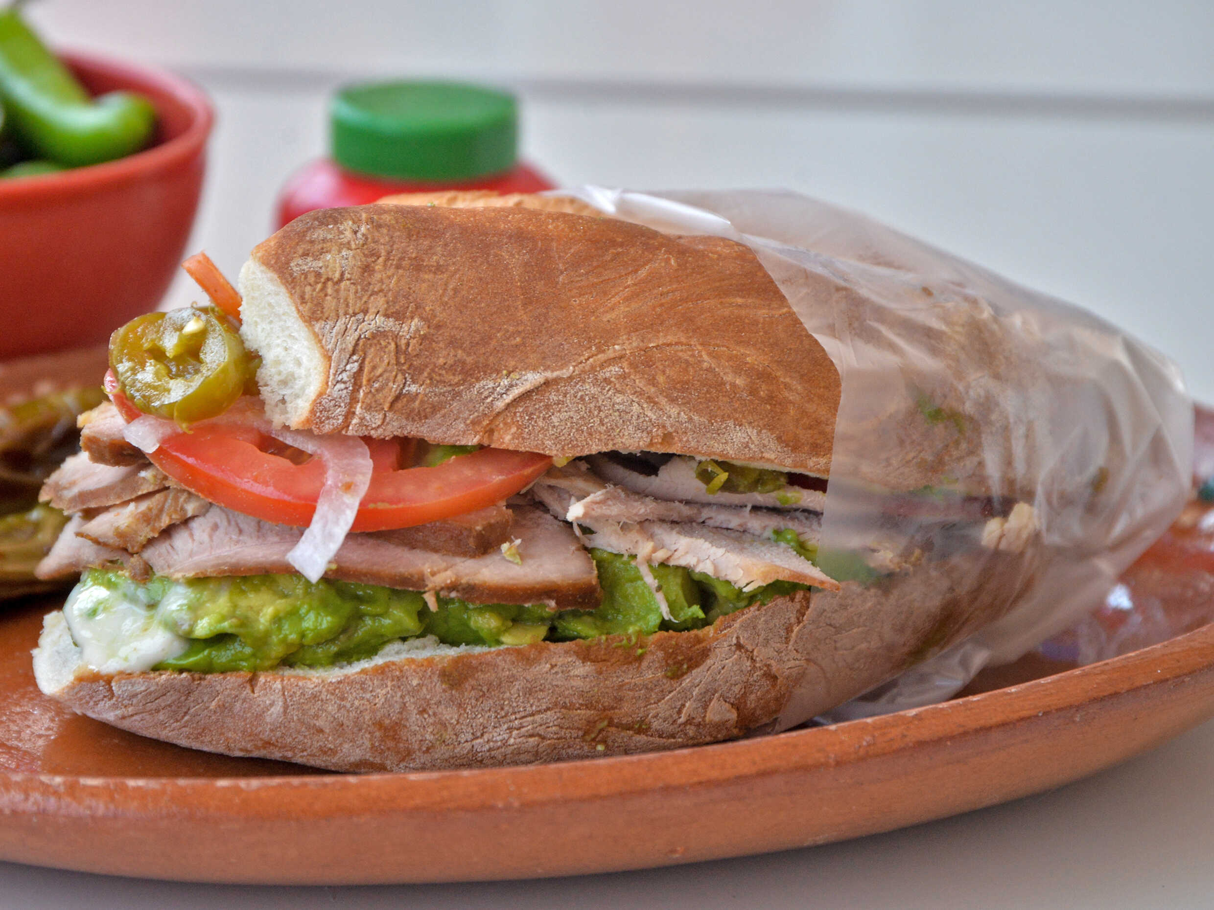 Pierna, aguacate, queso blanco, mayonesa, mostaza, tómate, cebolla y chile jalapeño.