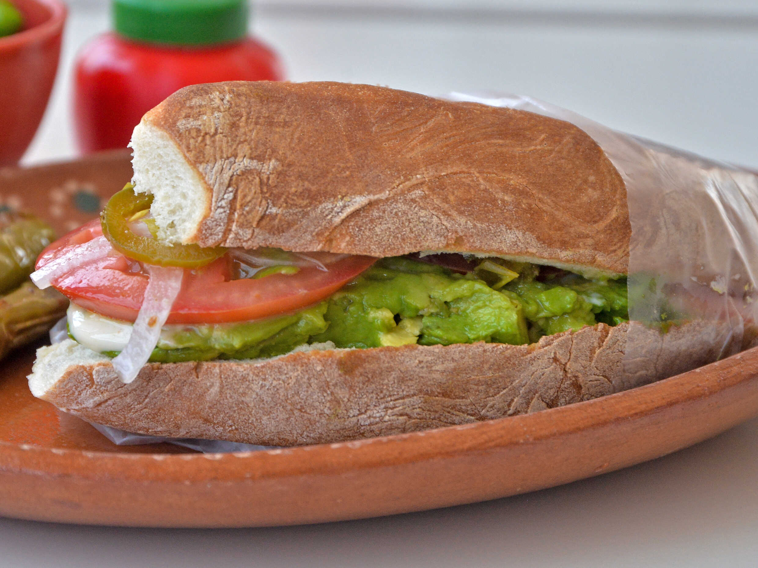 Aguacate, queso blanco, mayonesa, mostaza, tómate, cebolla y chile jalapeño.