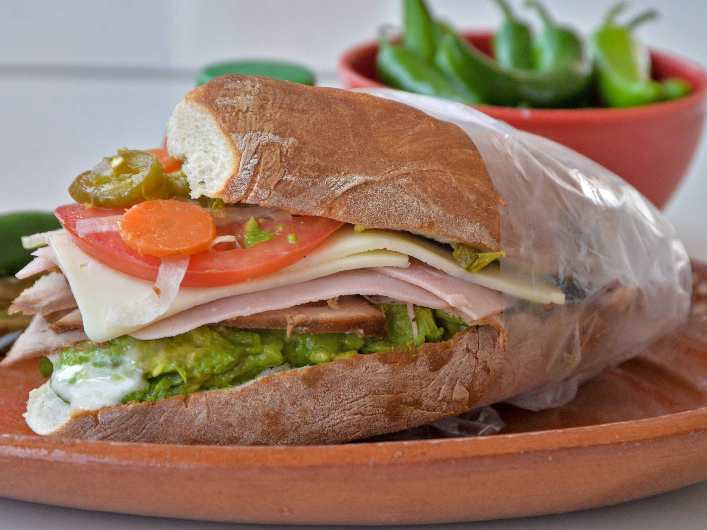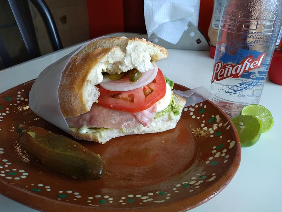 Pierna, aguacate, jamón, queso blanco, mayonesa, mostaza, tómate, cebolla y chile jalapeño.