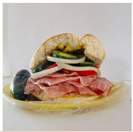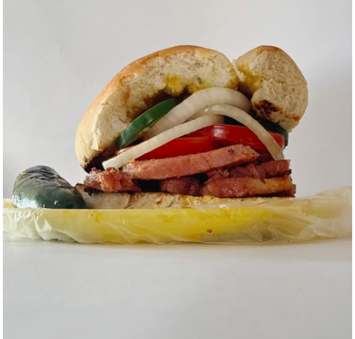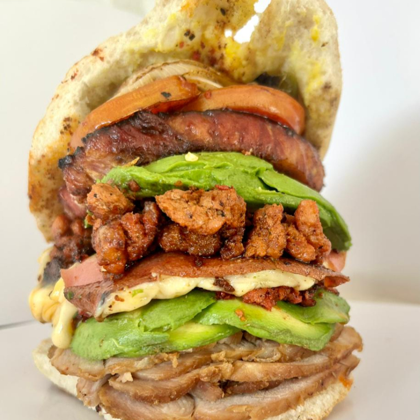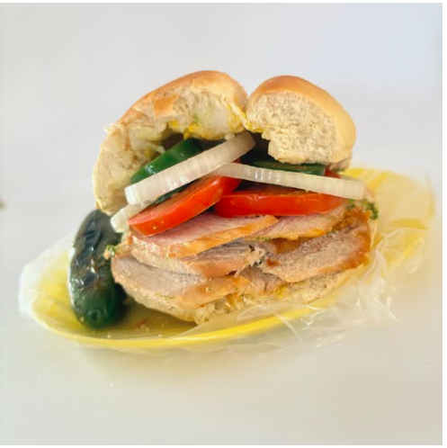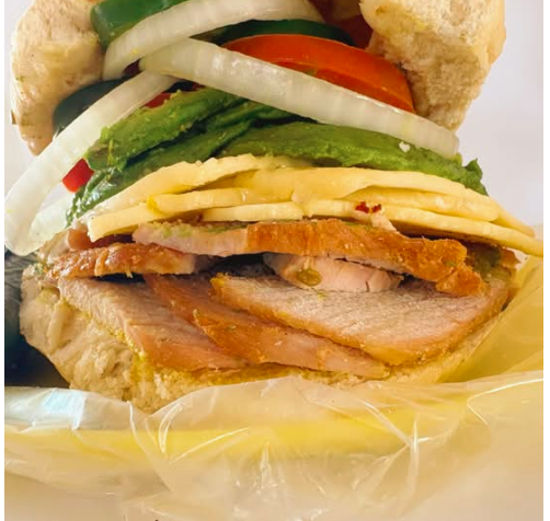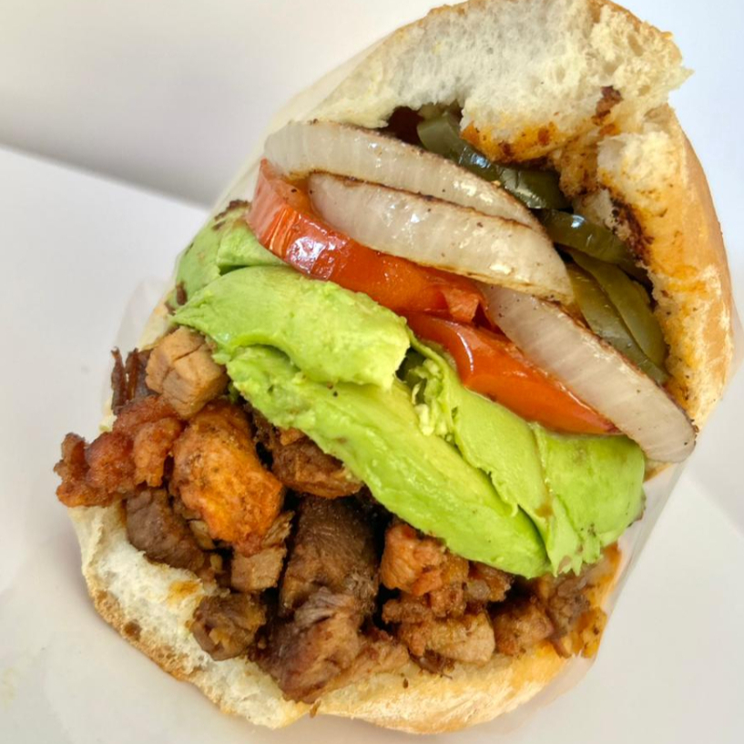 Delicioso pan francés lagunero, con carnitas, adobada, jamón, queso amarillo, queso blanco, chuleta, chorizo, aguacate y verdura (tomate guisado, cebolla guisada y chiles curtidos).