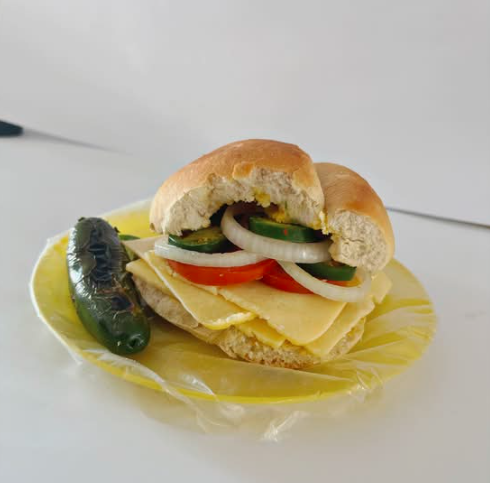 Delicioso pan francés lagunero, queso manchego y verdura (cebolla, tomate y chiles curtidos).