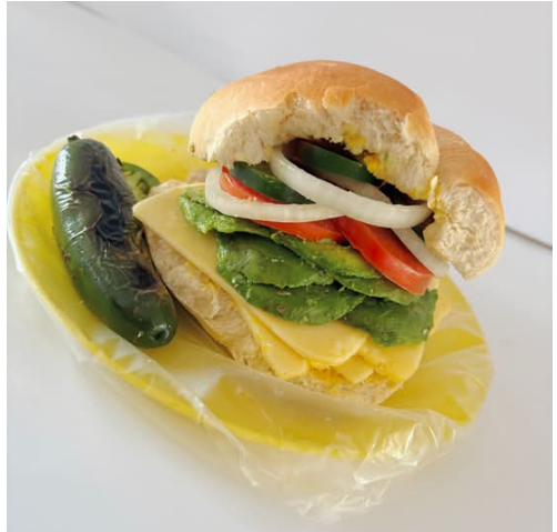 Delicioso pan francés lagunero, queso blanco, aguacate y verdura (cebolla, tomate y chiles curtidos).