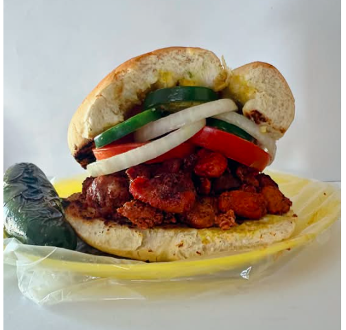 Delicioso pan francés lagunero, con adobada acompañado de cebolla asada y tomate asado con chiles curtidos.