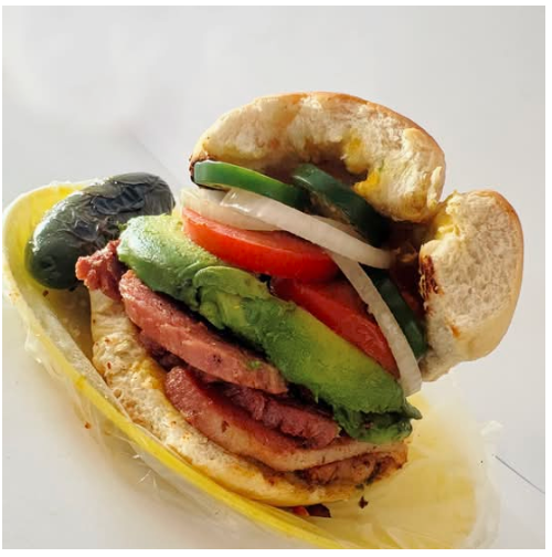 Delicioso pan francés lagunero, carne a elegir carnitas o adobada, queso, aguacate y verdura (cebolla, tomate y chiles curtidos).