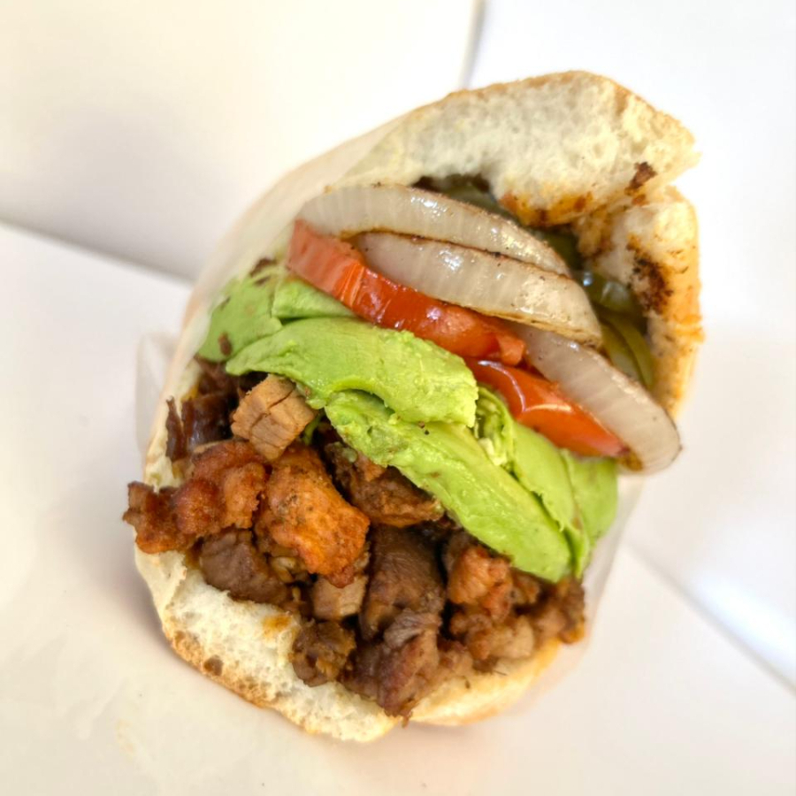 Delicioso pan francés lagunero, carnitas con adobada, aguacate y verdura (cebolla asada, tomate asado y chiles curtidos).