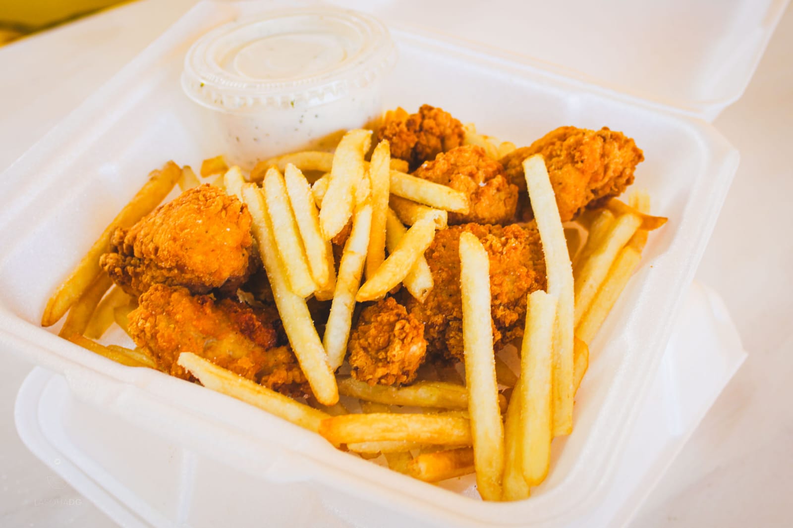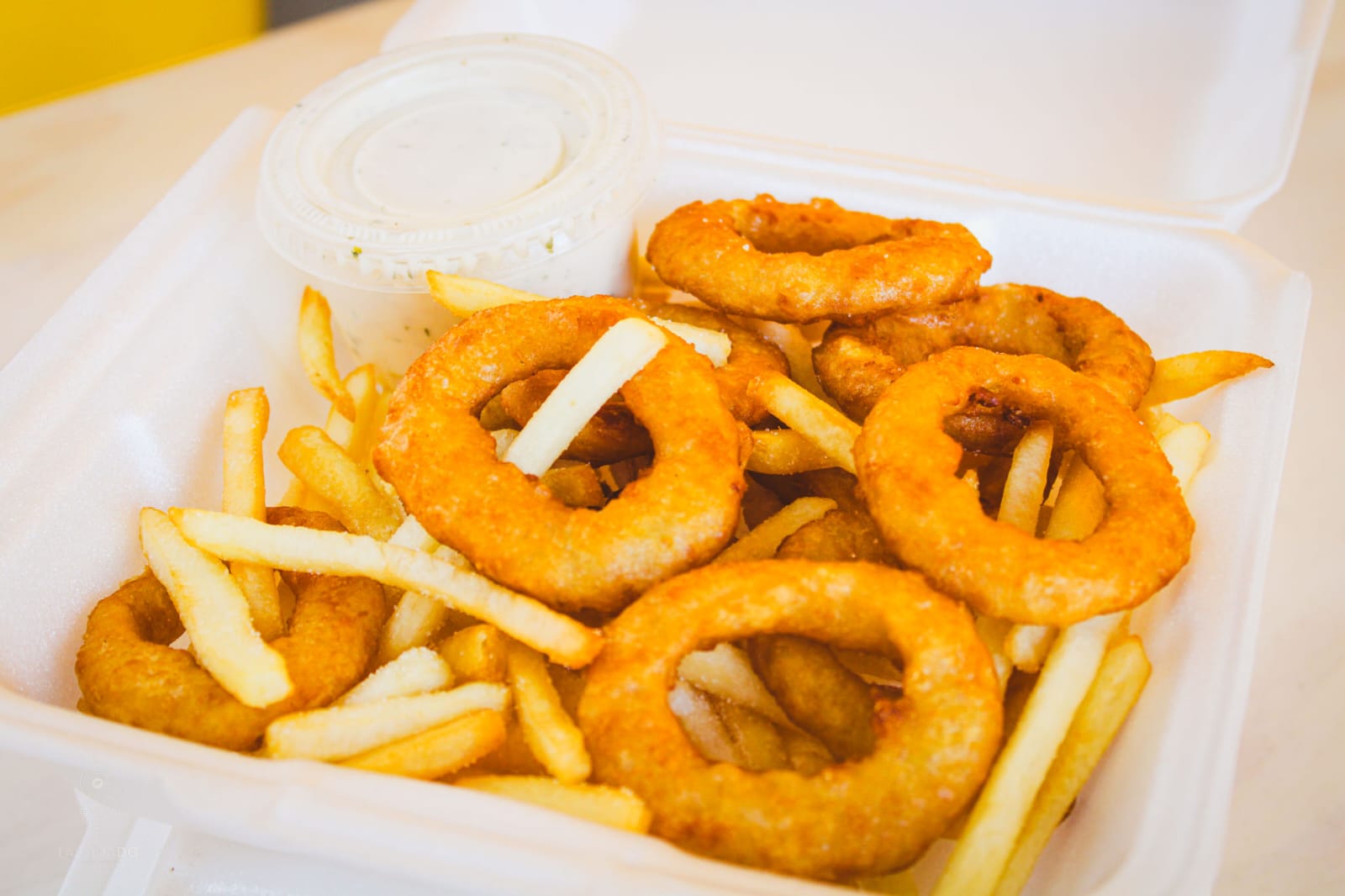 12 Aros de cebolla, papas fritas y aderezo ranch.