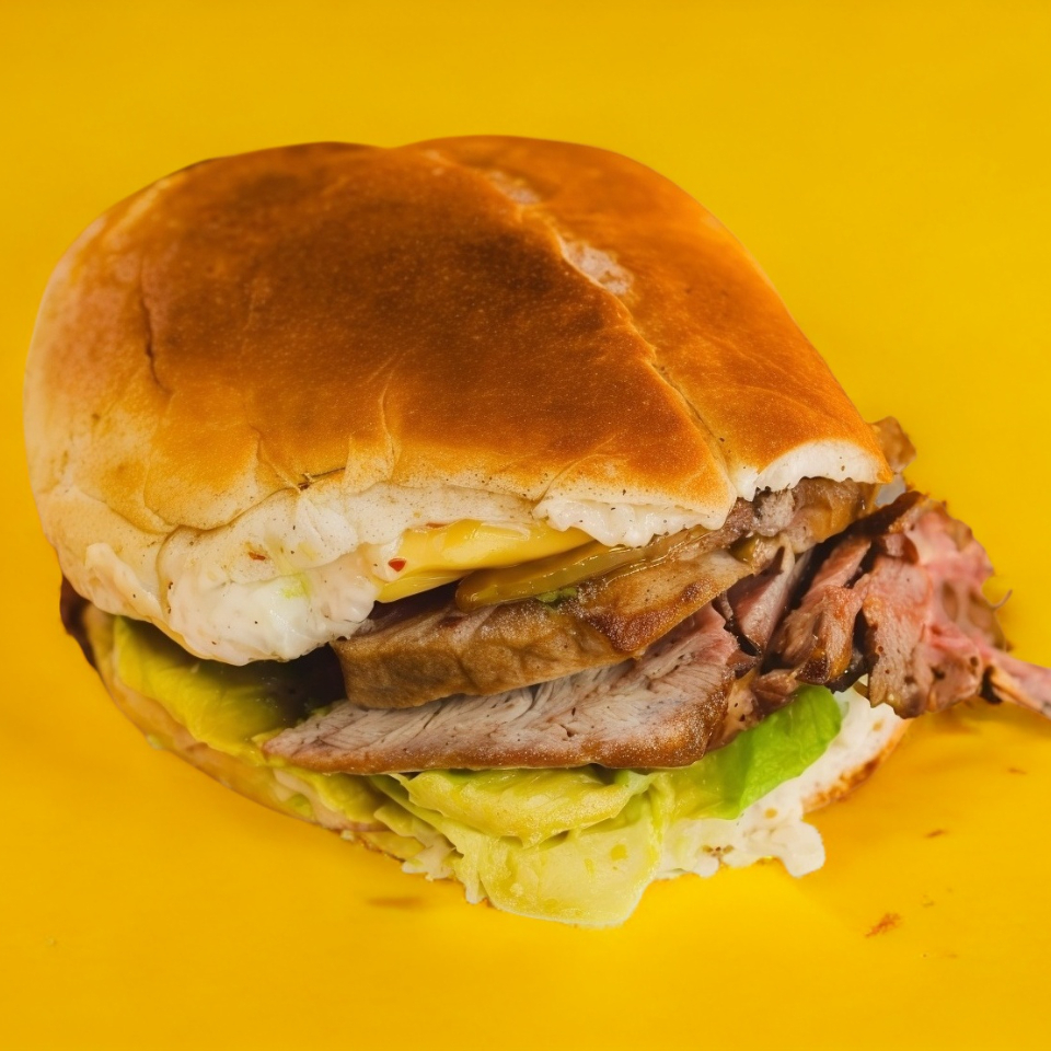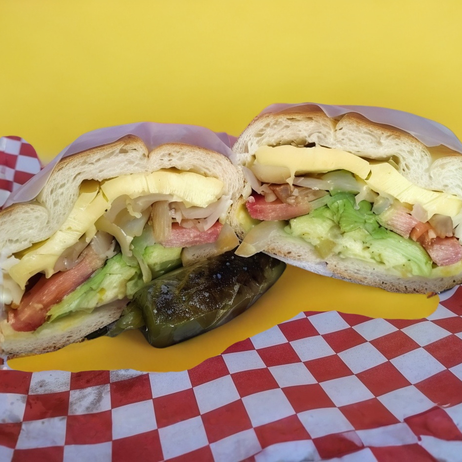 Carne de res (170 g), queso amarillo, cebolla asada, tomate, lechuga, chile curtido y aderezos.