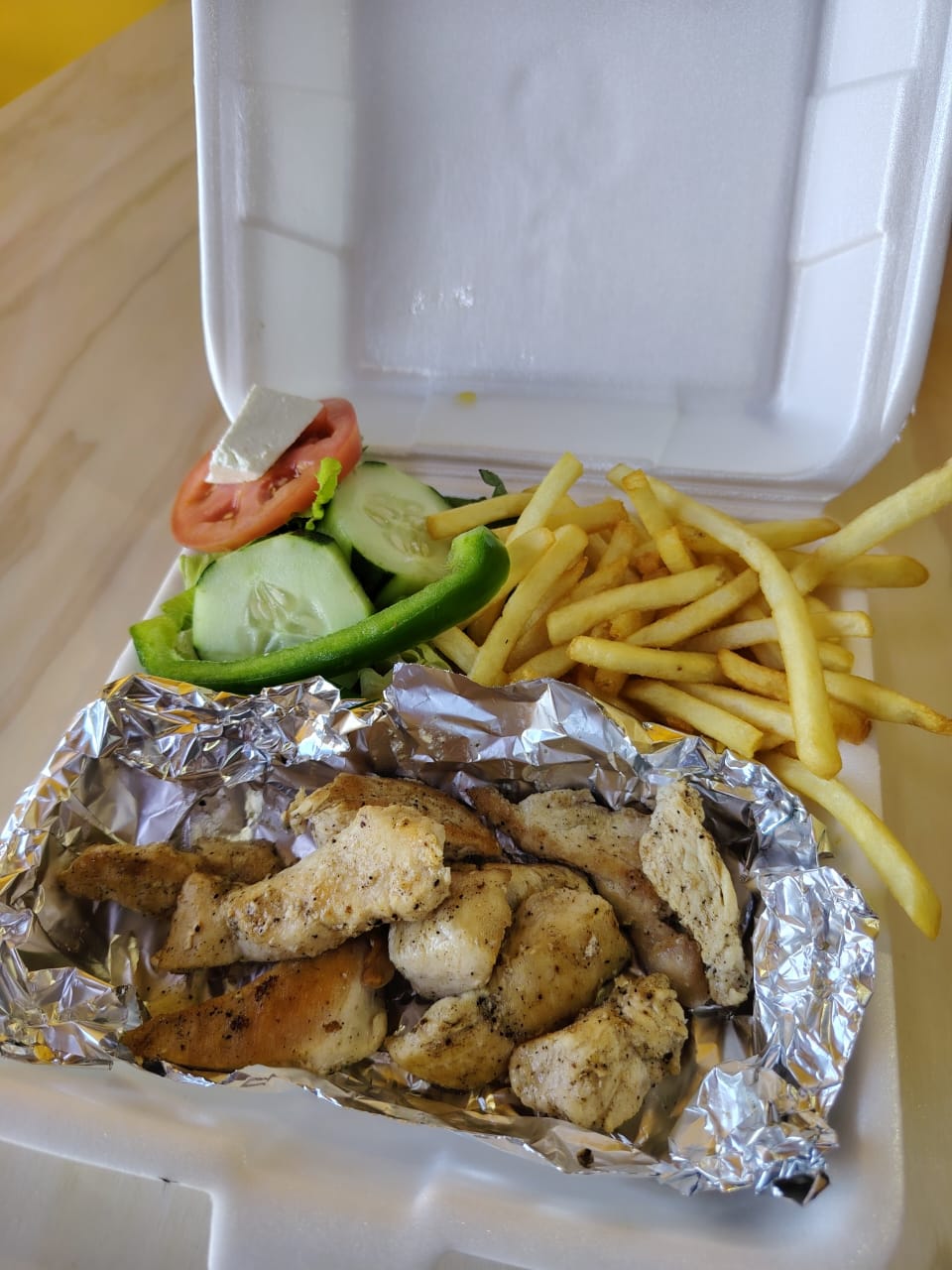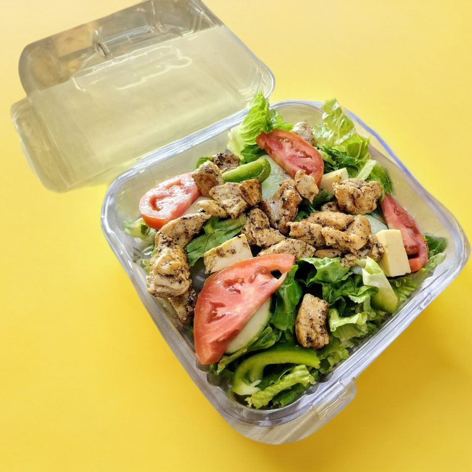 Pollo a la parrilla (100 g), lechuga, pepino, queso panela, tomate, morrón verde, papas fritas y aderezo ranch.