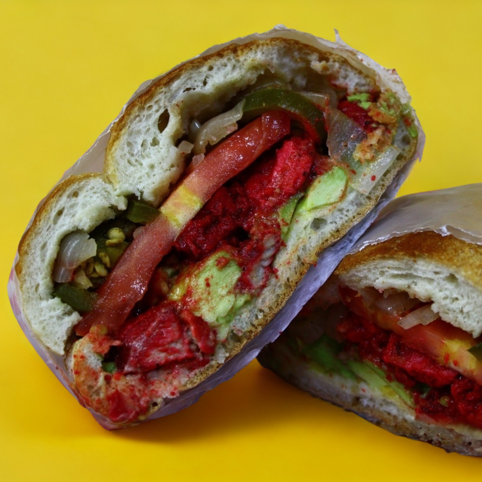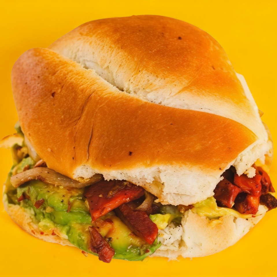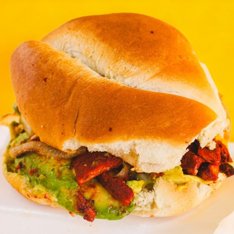 Carne adobada o carnita (160 g), doble aguacate, cebolla asada, tomate, chile curtido, chile toreado y aderezos.