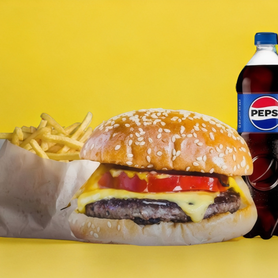 Hamburguesa grande (170 g carne de res), papas fritas y 1 refresco Pepsi 600 ml.