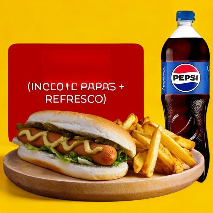 Dos hot dog grandes, papas fritas y 1 refresco Pepsi 600 ml.