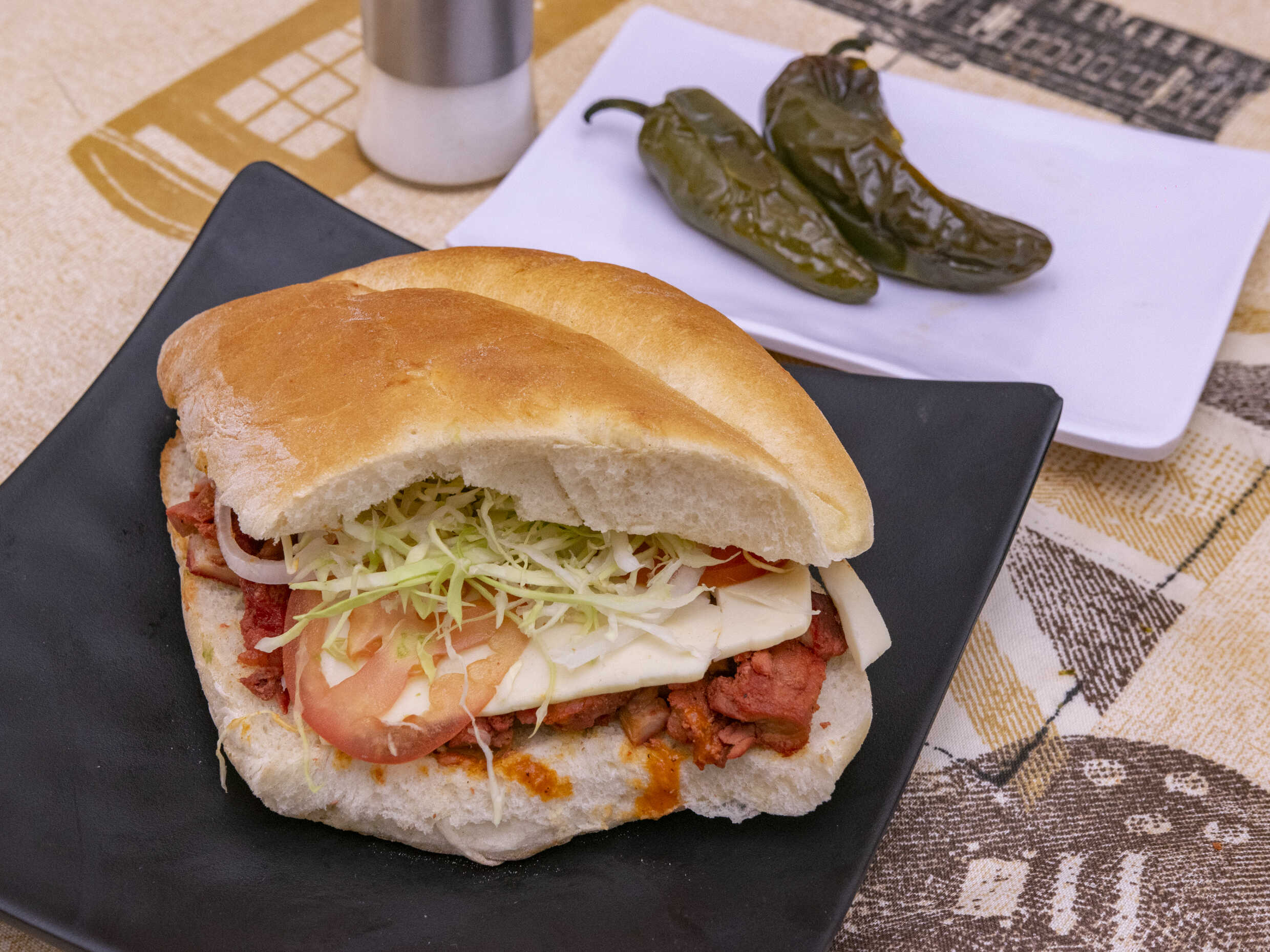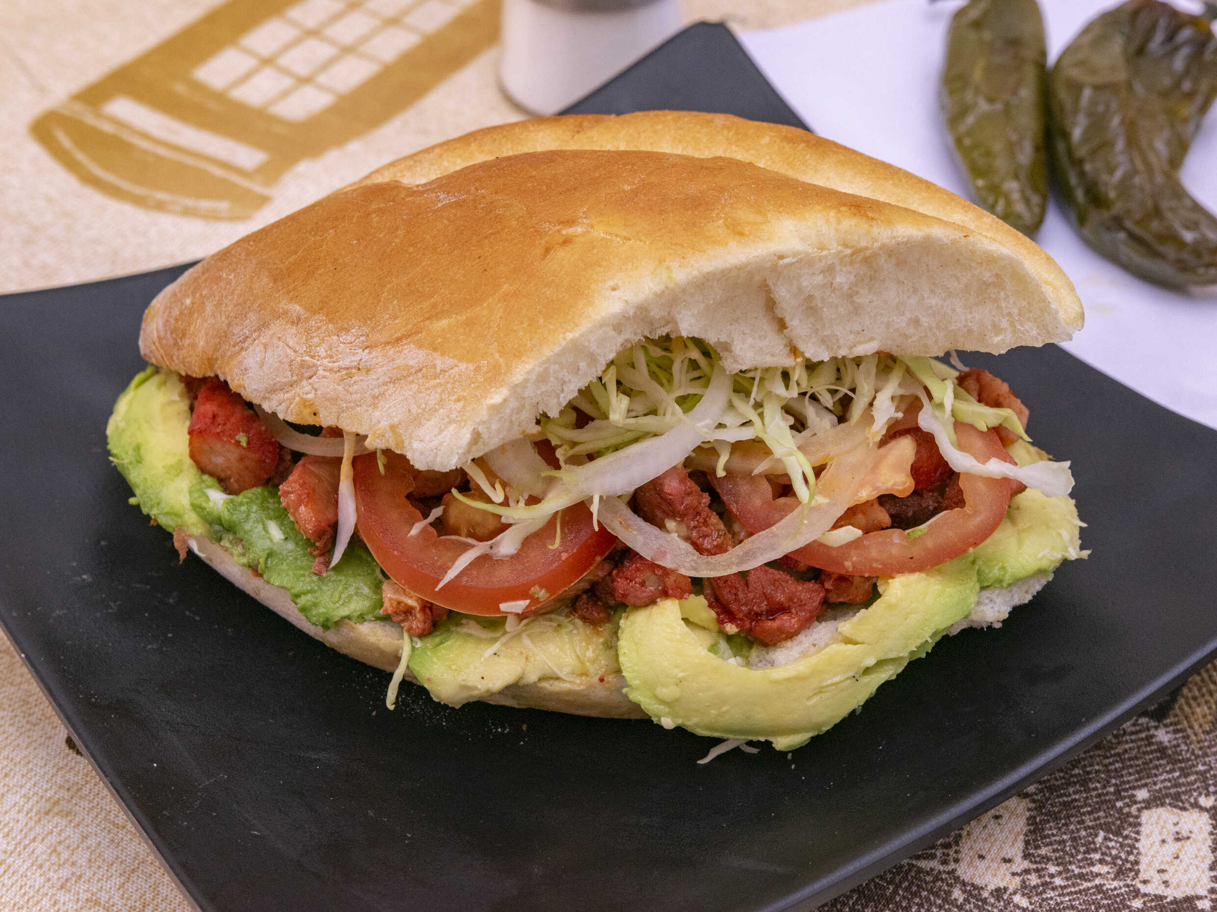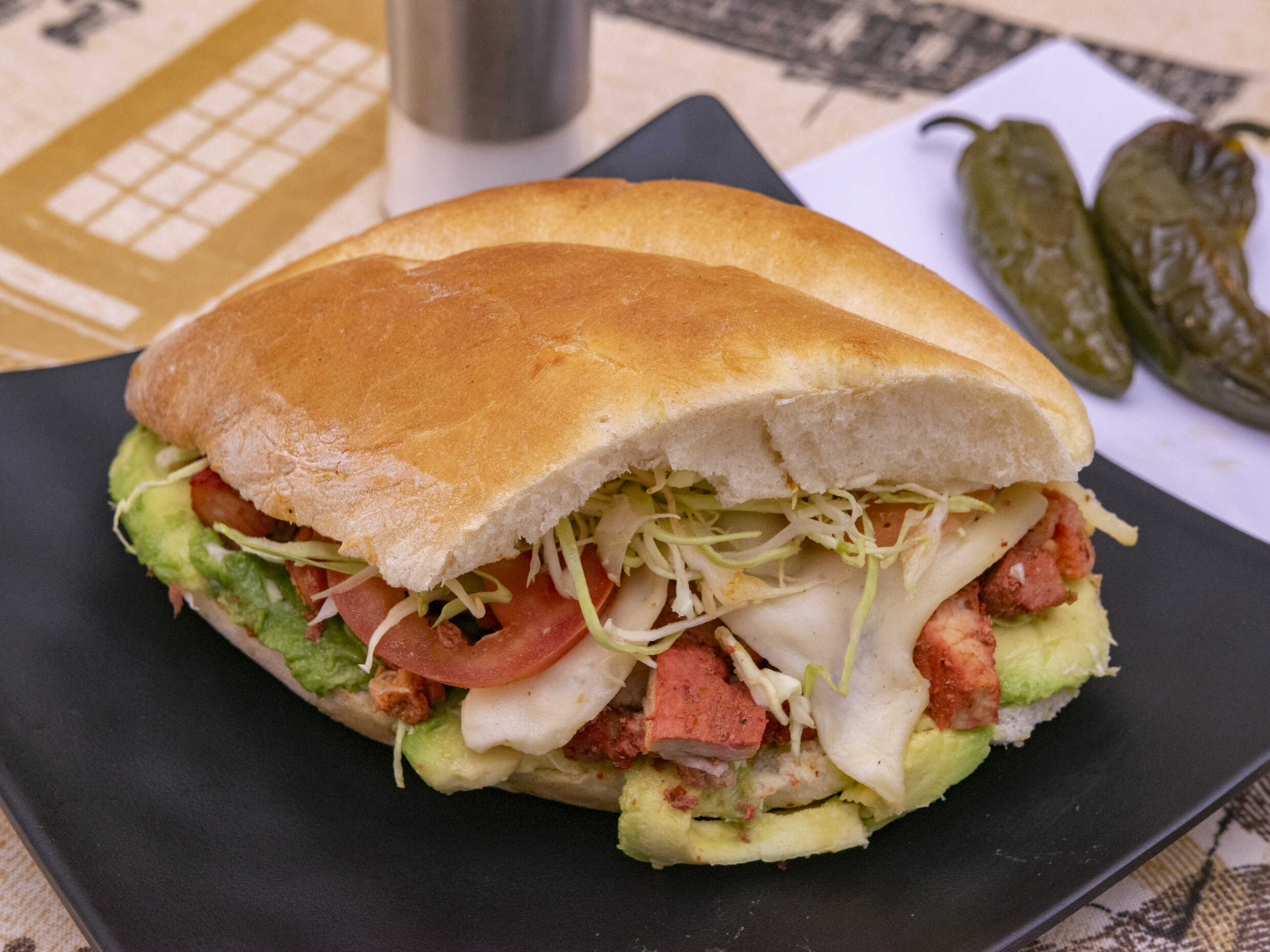 Lonche con Adobada, costra de queso, aguacate, tomate,cebolla,repollo y chiles toreados. para una persona