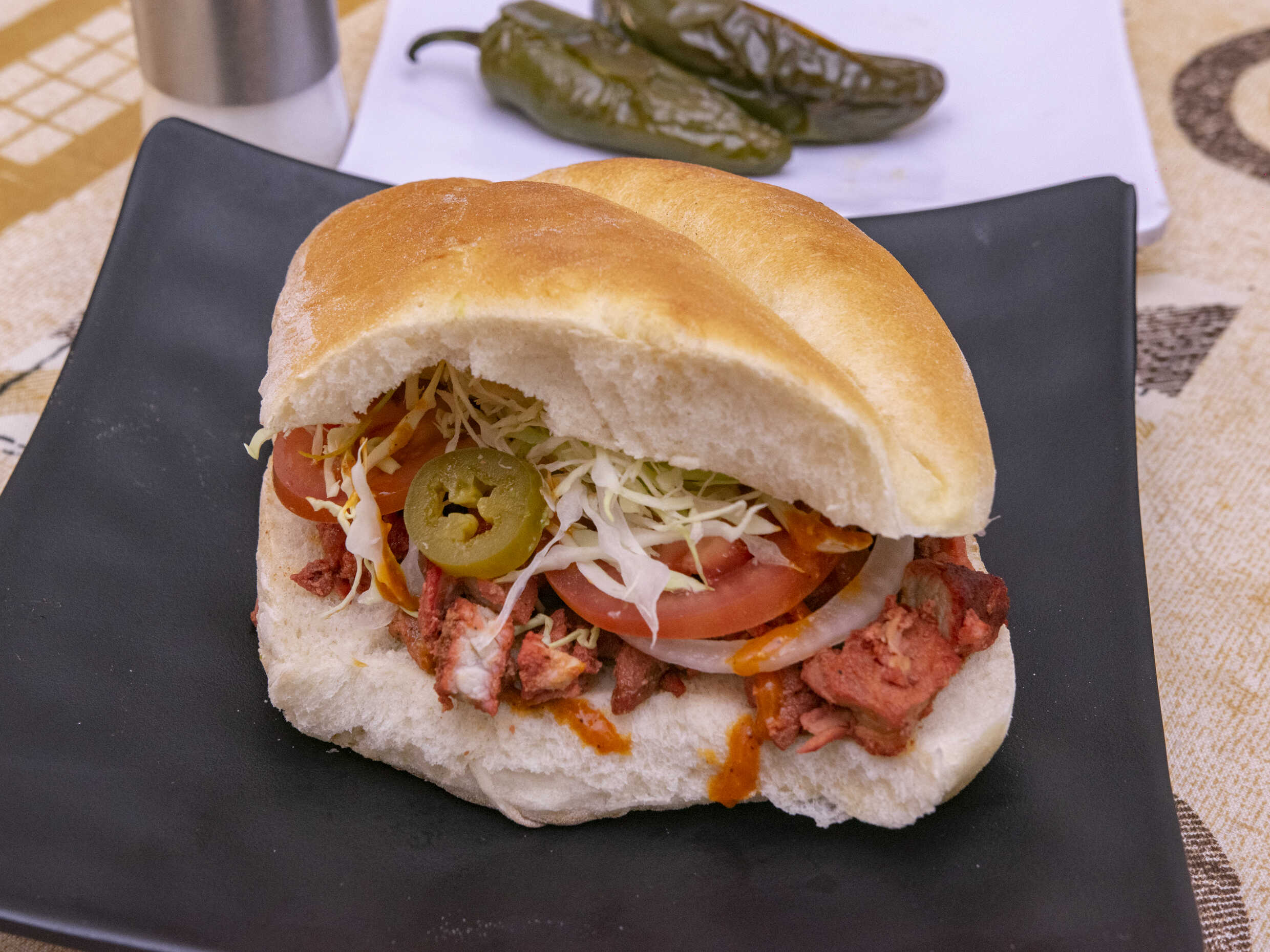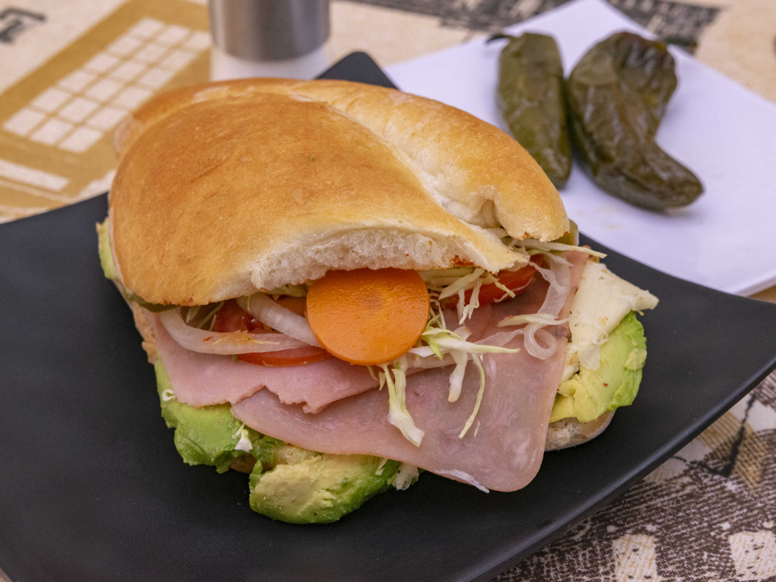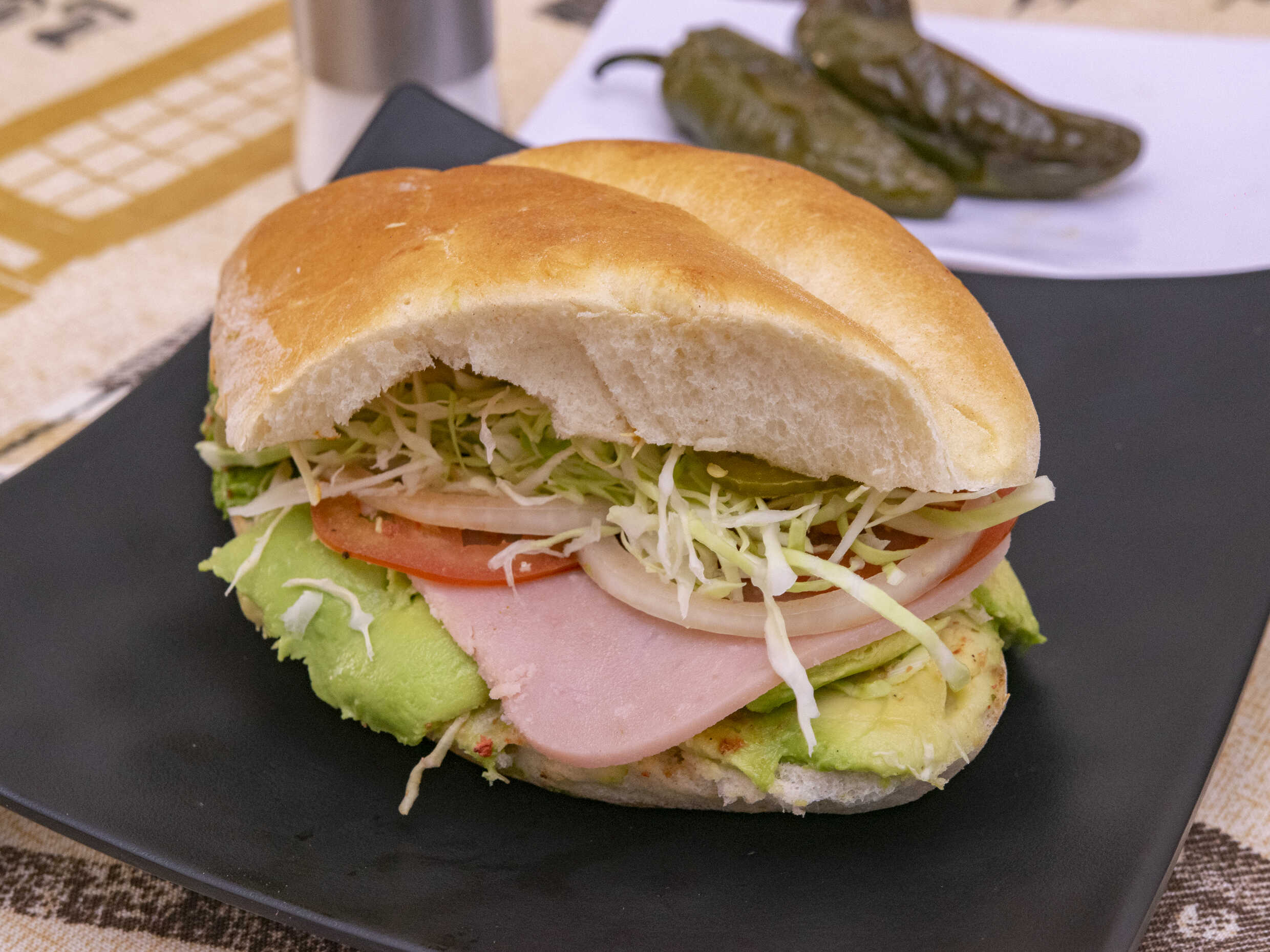 Lonche con Adobada, costra de queso, aguacate, tomate,cebolla,repollo y chiles toreados. para una persona