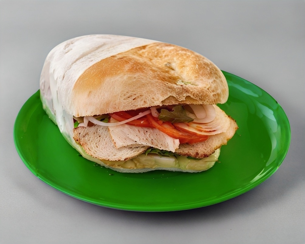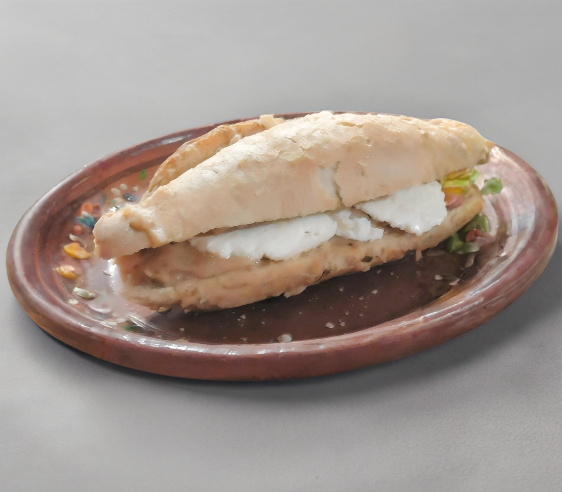 Lonche de carnitas (platillo personal): con chile jalapeño, cebolla, tomate, mayonesa y mostaza.