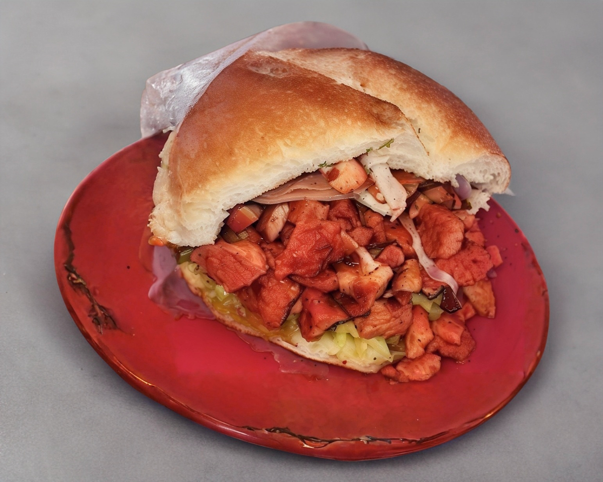 Lonche de adobada (platillo personal): incluye chile jalapeño, tomate, cebolla, mayonesa y mostaza.