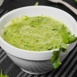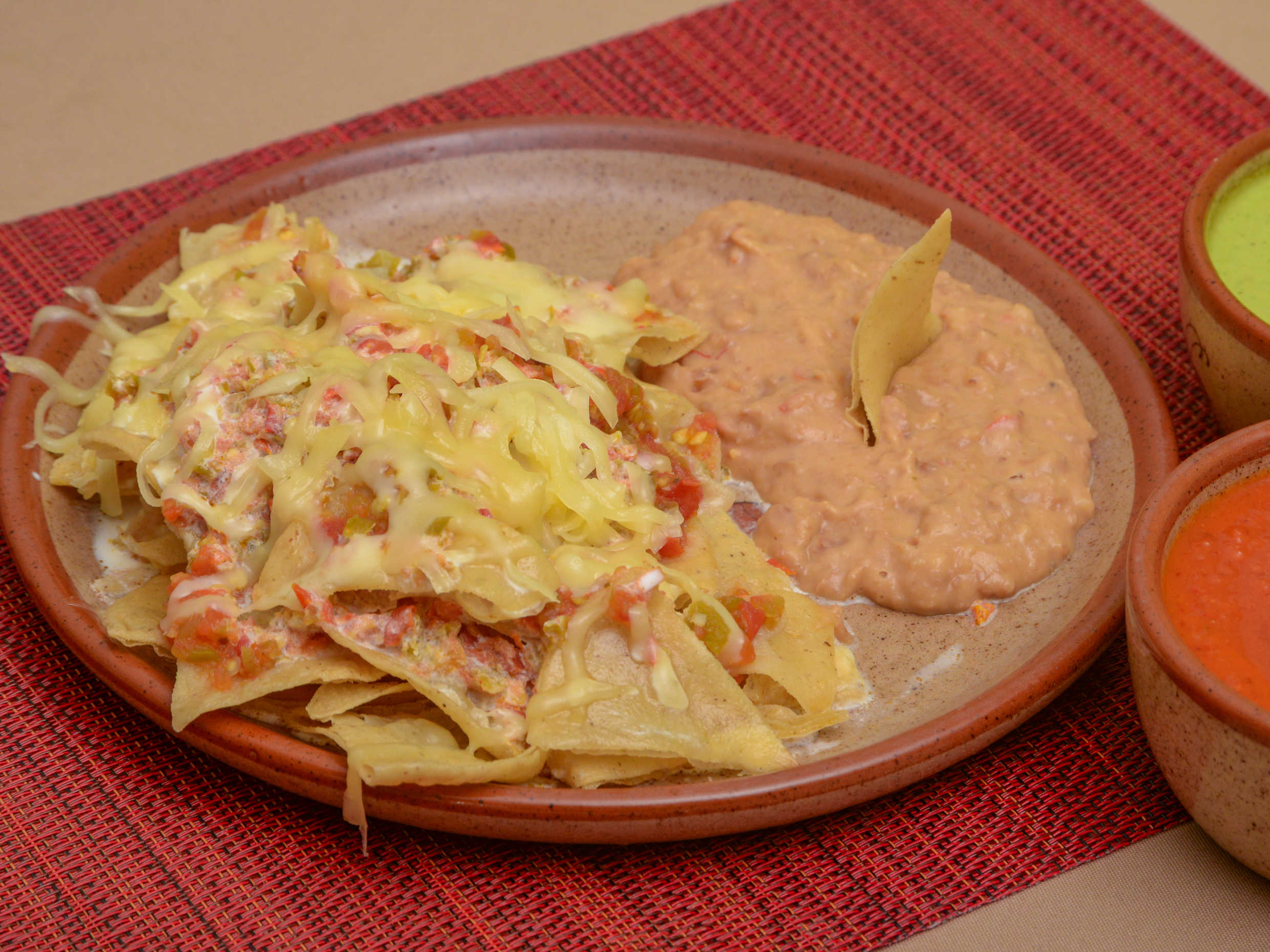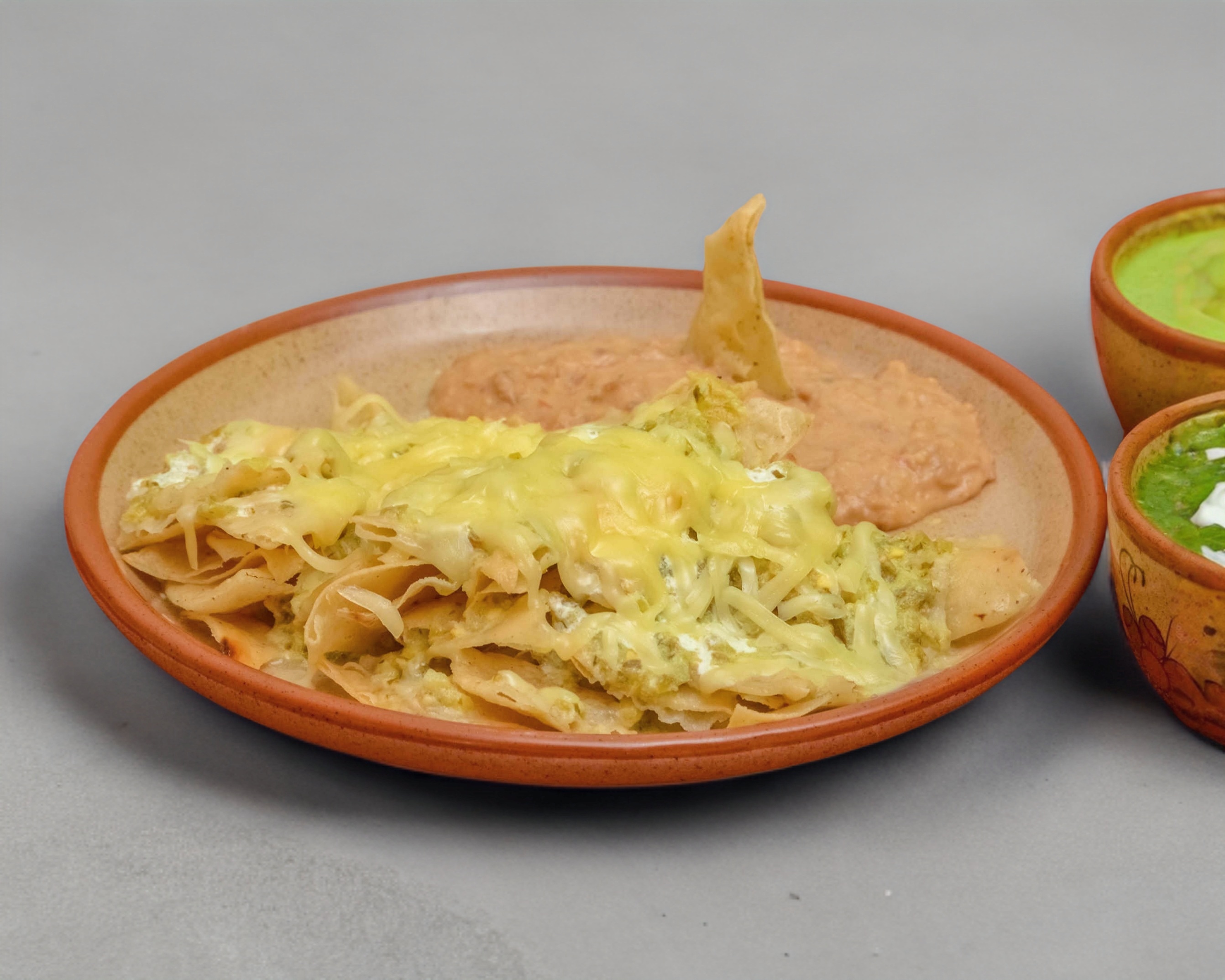 Base de totopos de tortilla de maíz, bañados en salsa suiza verde, crema y queso. Acompañados de frijolitos.