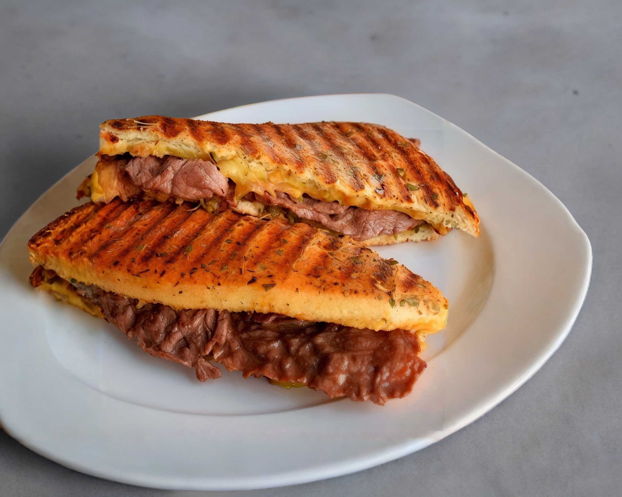 Pan de panini, jugosa carne de vampiro, frijoles. el guiso de tu elección y queso gratinado. Acompañado de ensalada.