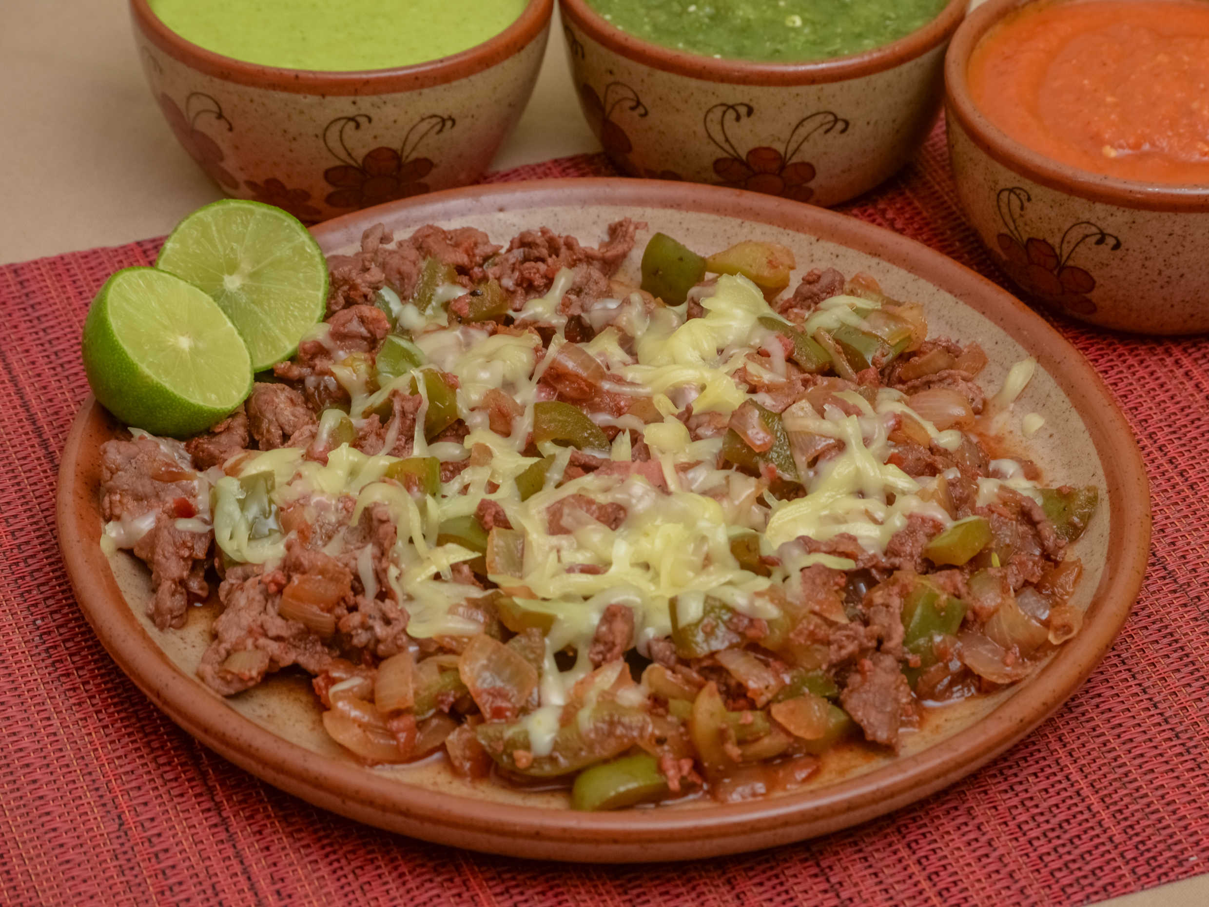 170 g. de jugosa carne de vampiro con chorizo, pimiento morrón, cebolla y queso gratinado. Acompañada de tortillas de maíz, salsas y limones.