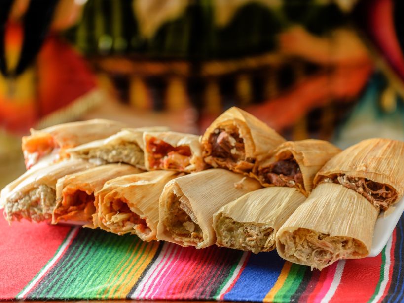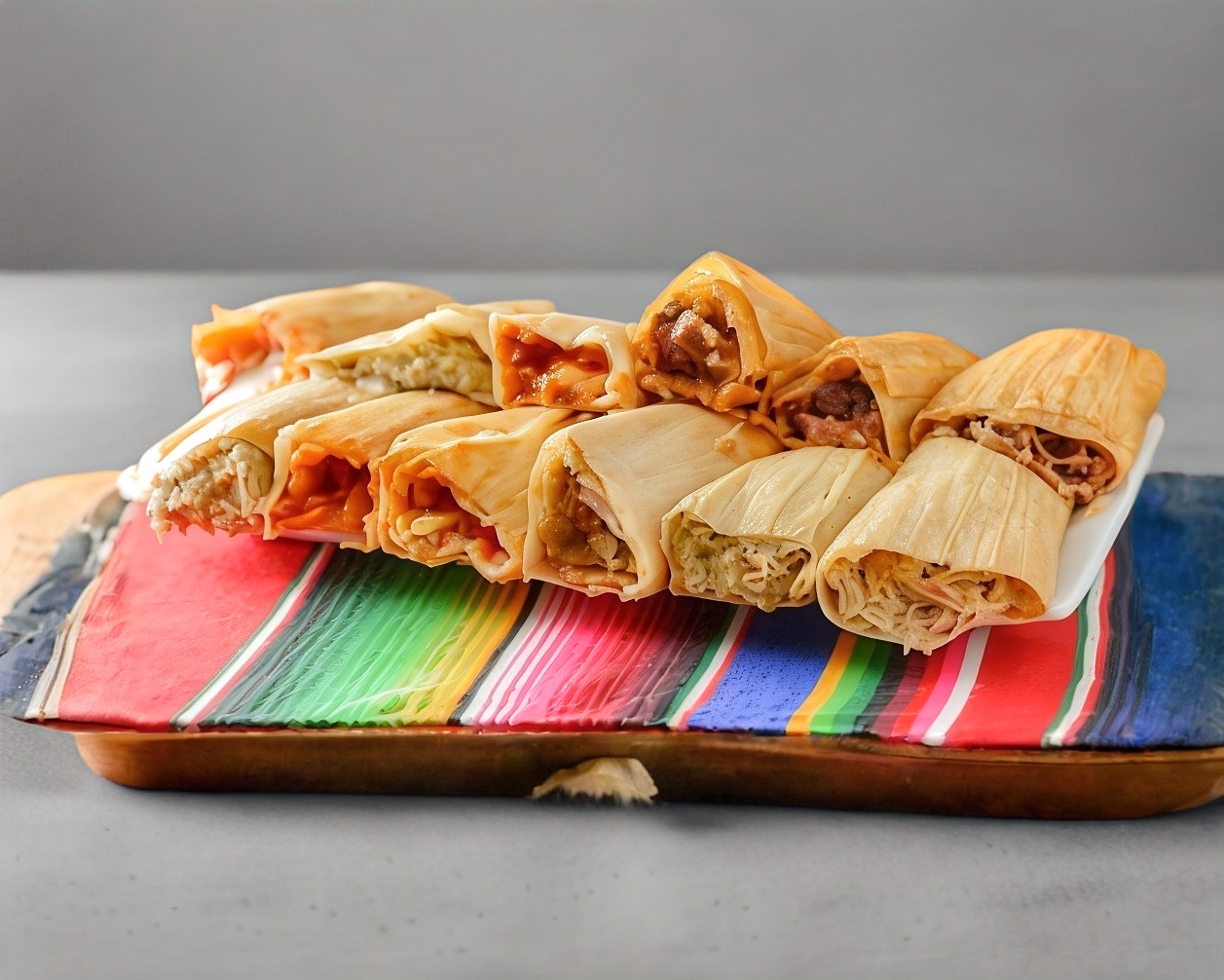 Pan bolillo con mantequilla, relleno de frijoles, tamal a elección, queso panela y crema.