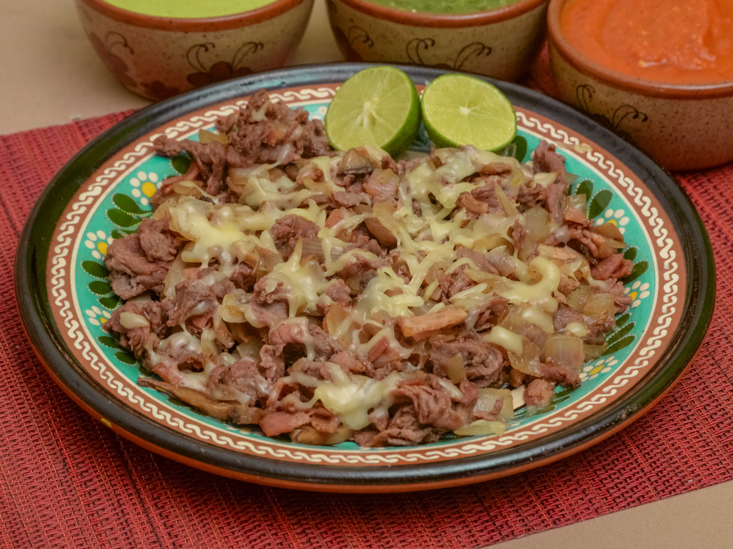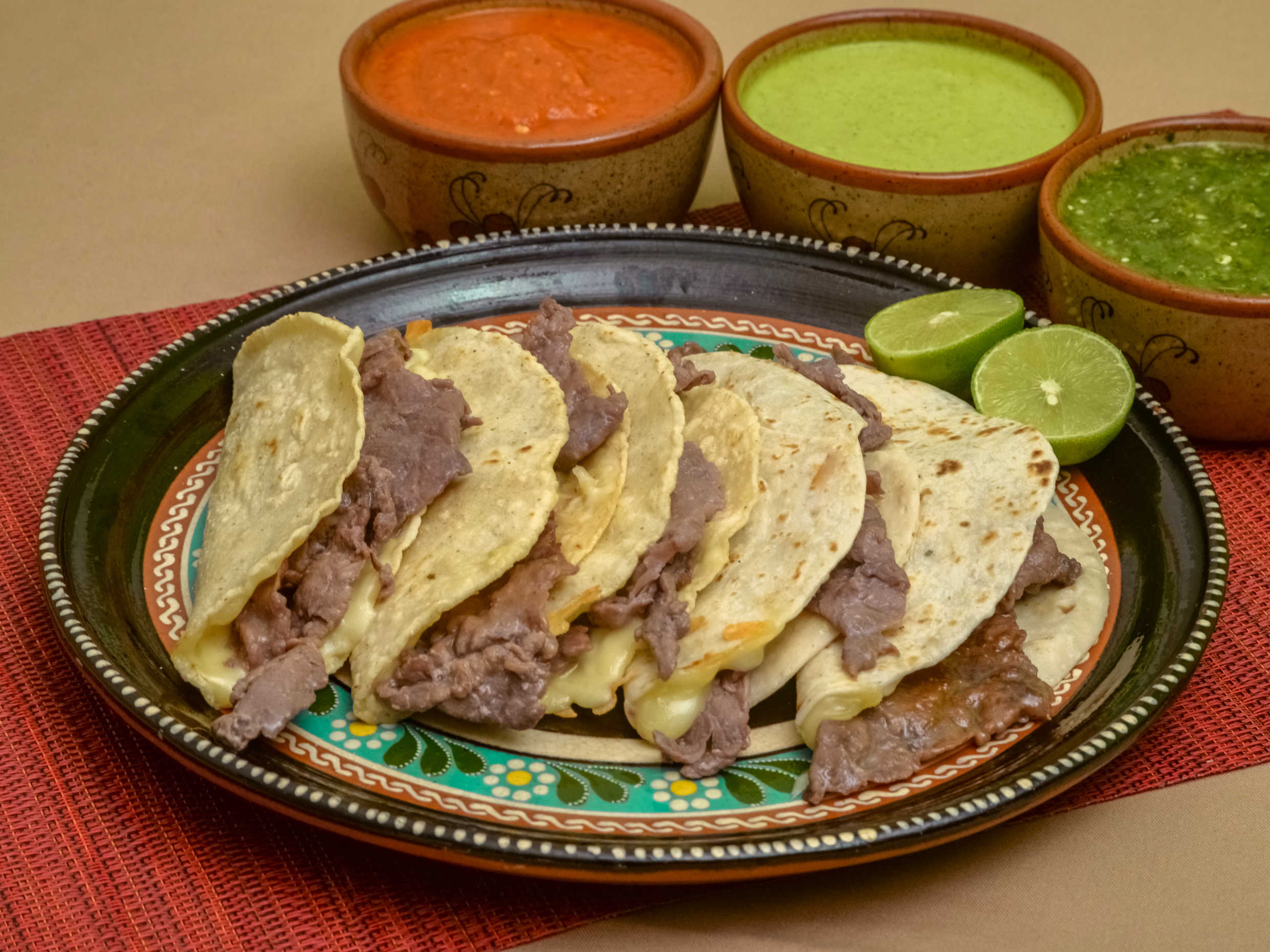 Tortilla de maíz o harina recién hecha con jugosa carne asada y queso gratinado.