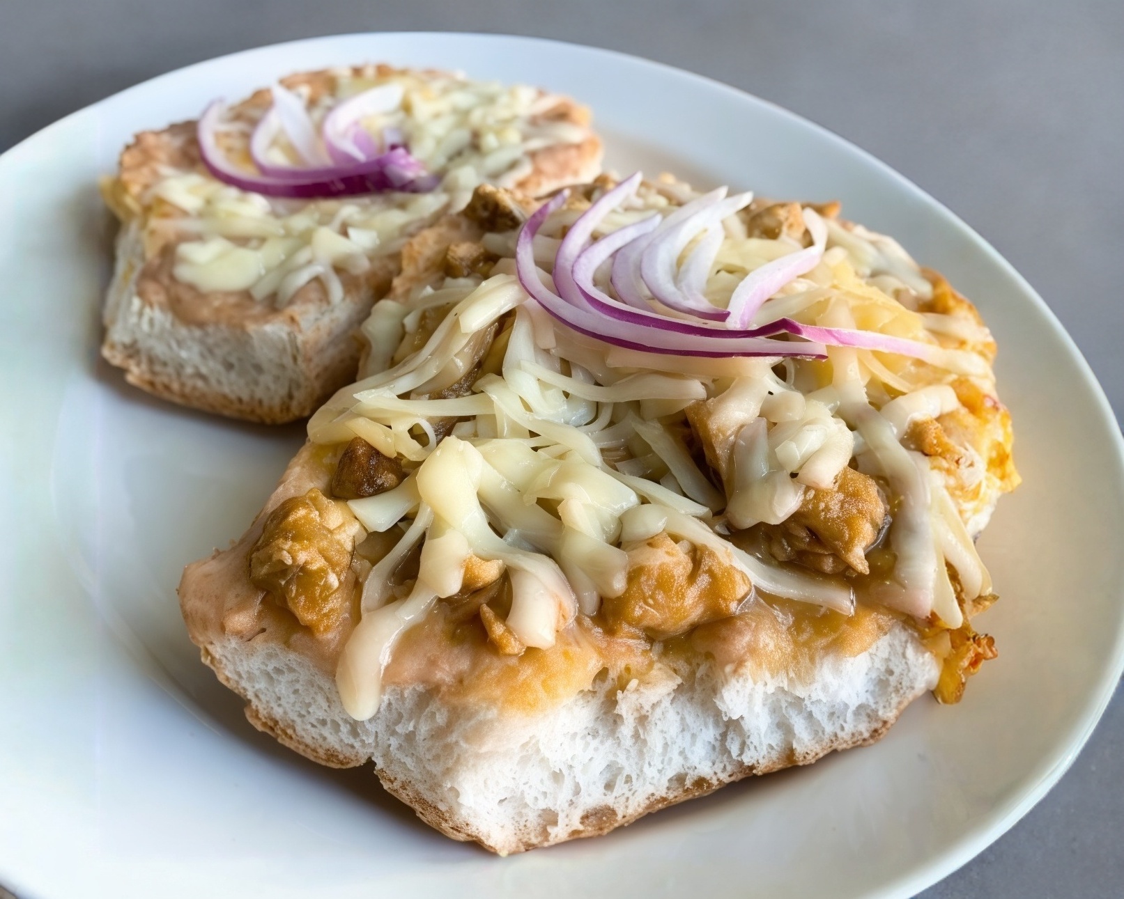 Orden de molletes (2 mitades de pan francés), con mantequilla, frijoles refritos y queso Chihuahua gratinado.