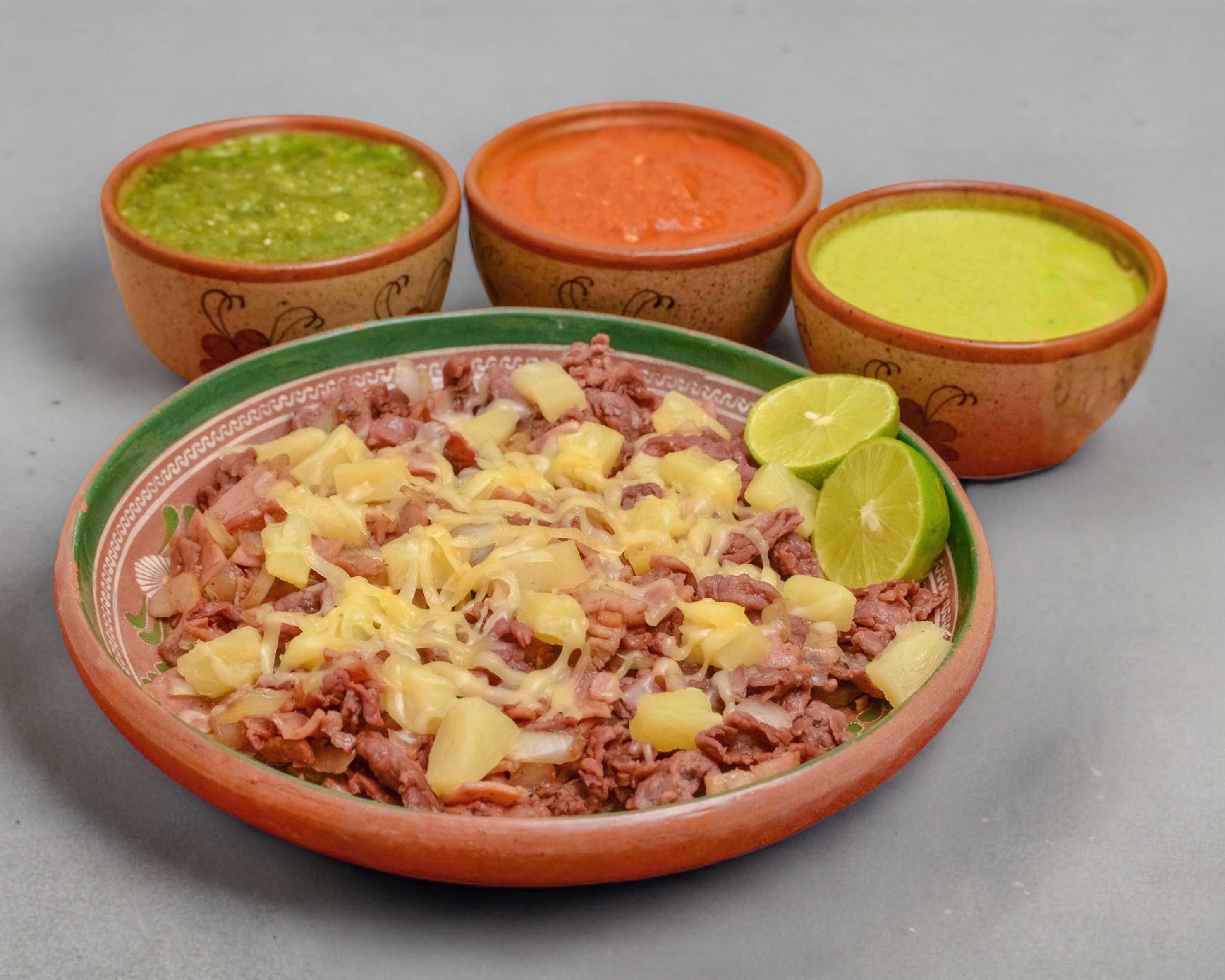 170 g. de jugosa carne de vampiro con jamón, tocino, cebolla, piña y queso gratinado. Acompañada de tortillas de maíz, salsas y limones.