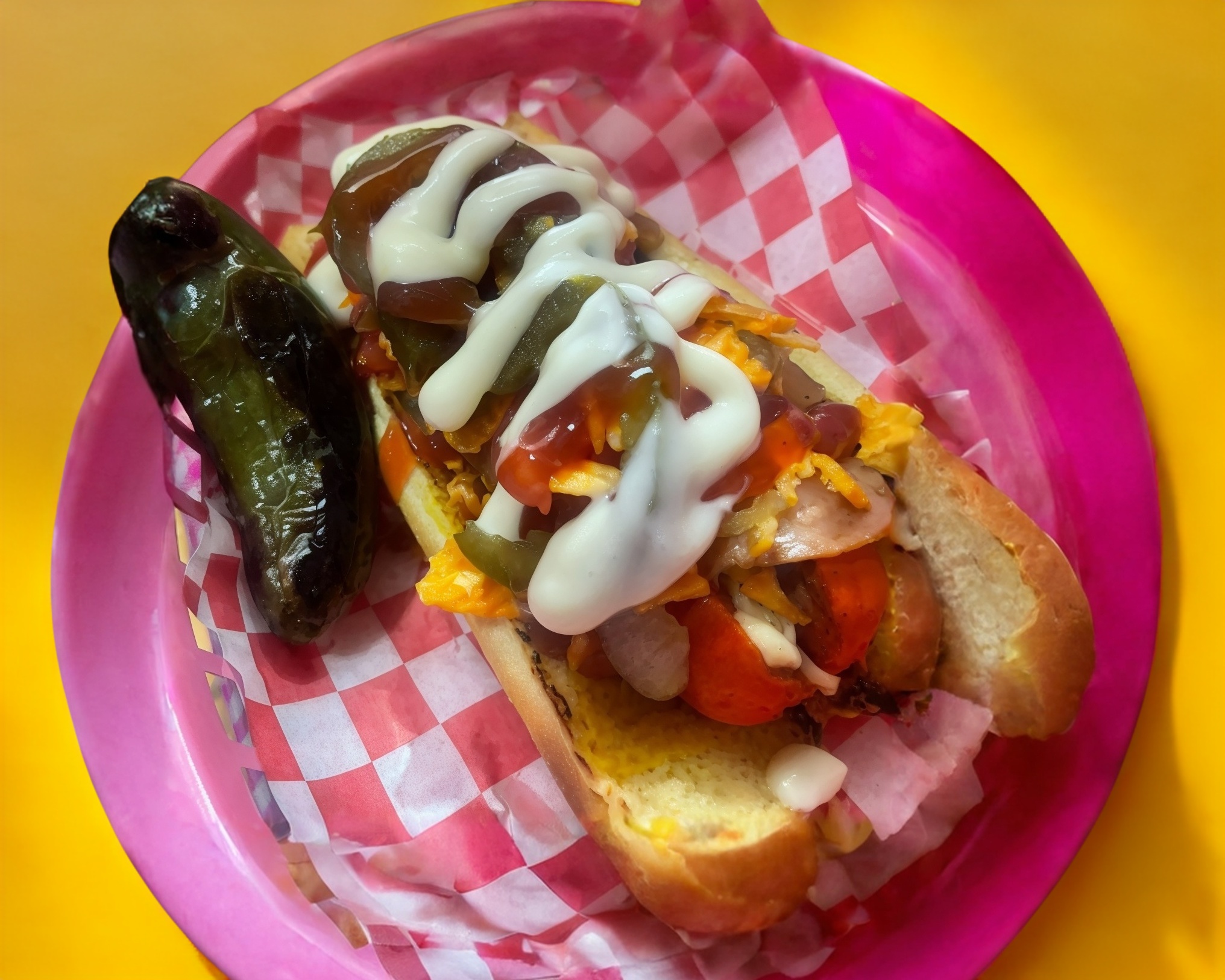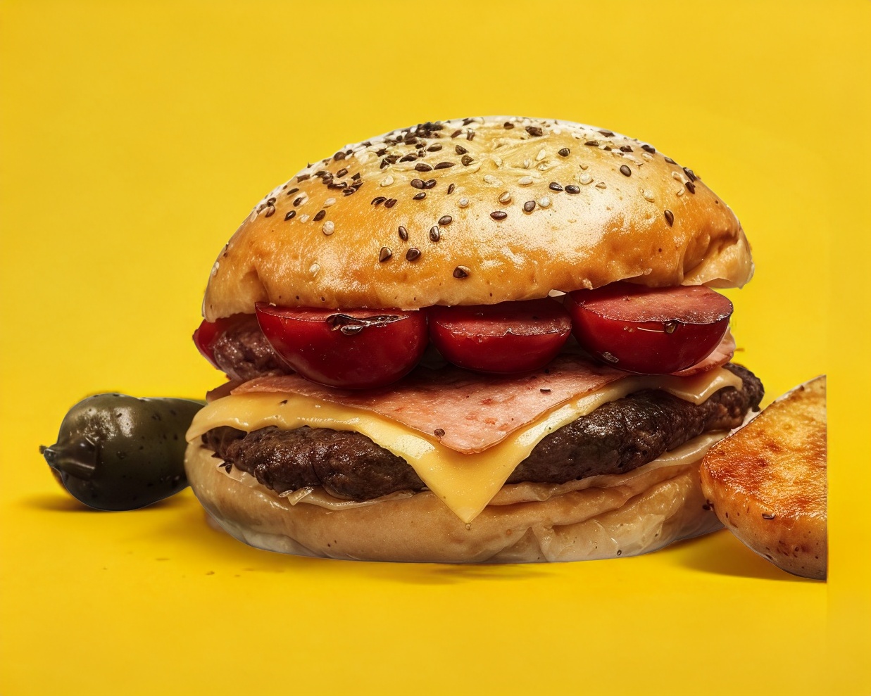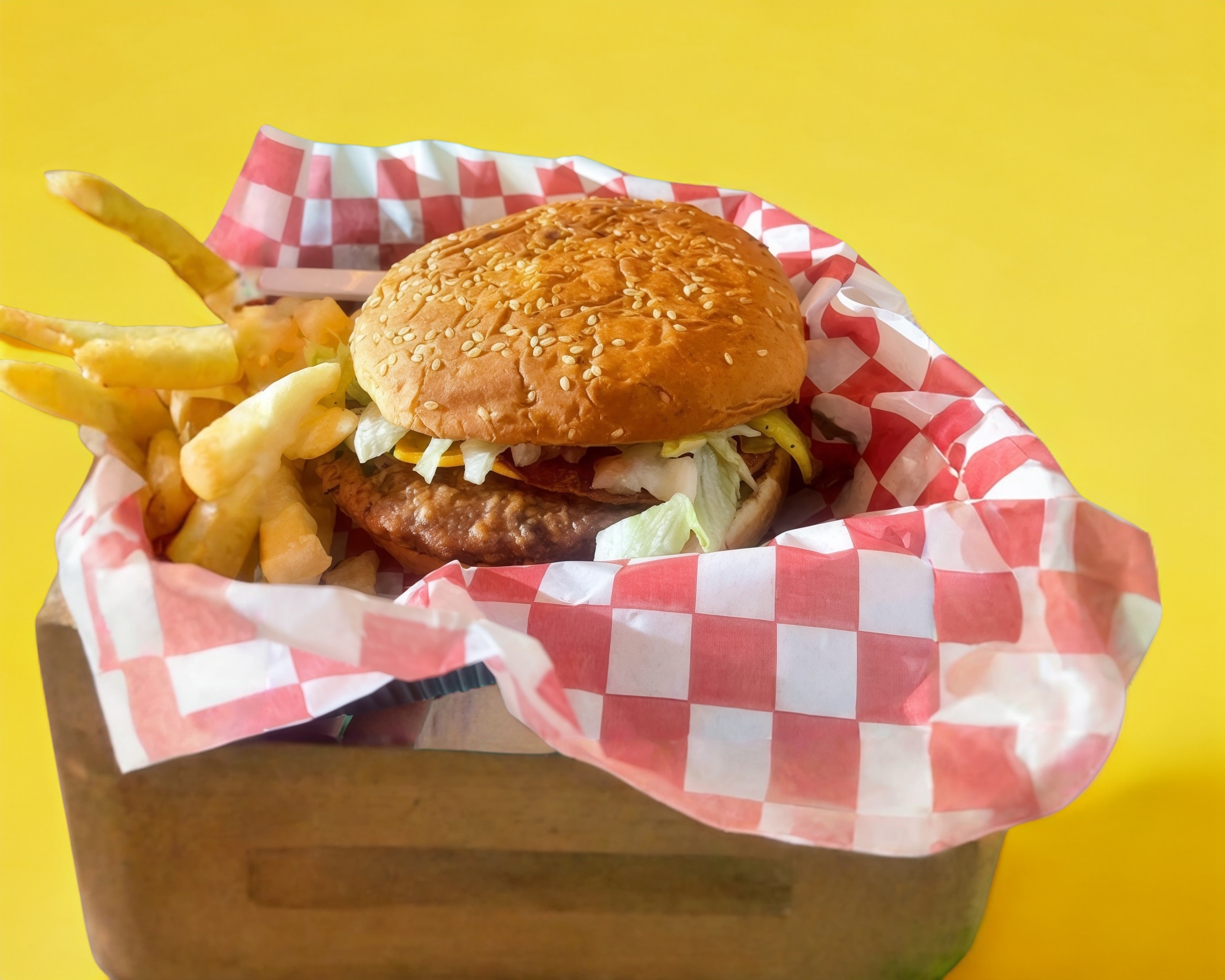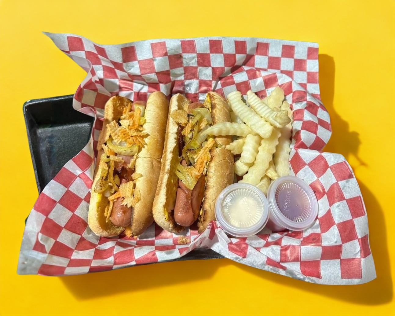 Doble carne, tocino, salchicha para asar, queso amarillo, jamon. ACOMPAÑADA DE PAPAS A LA FRANCESA.