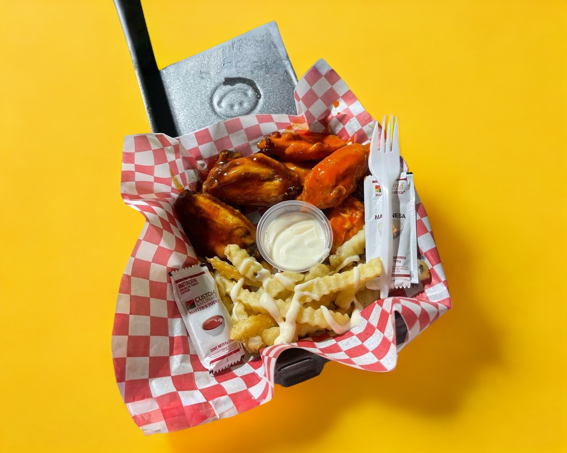 30 boneles o alitas acomañados de papas a la francesa, verdura y aderezos.