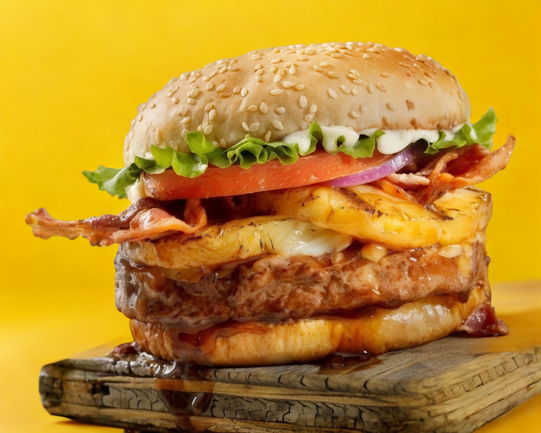 Carne, tocino, piña, queso amarillo, jamon. ACOMPAÑADA DE PAPAS A LA FRANCESA.