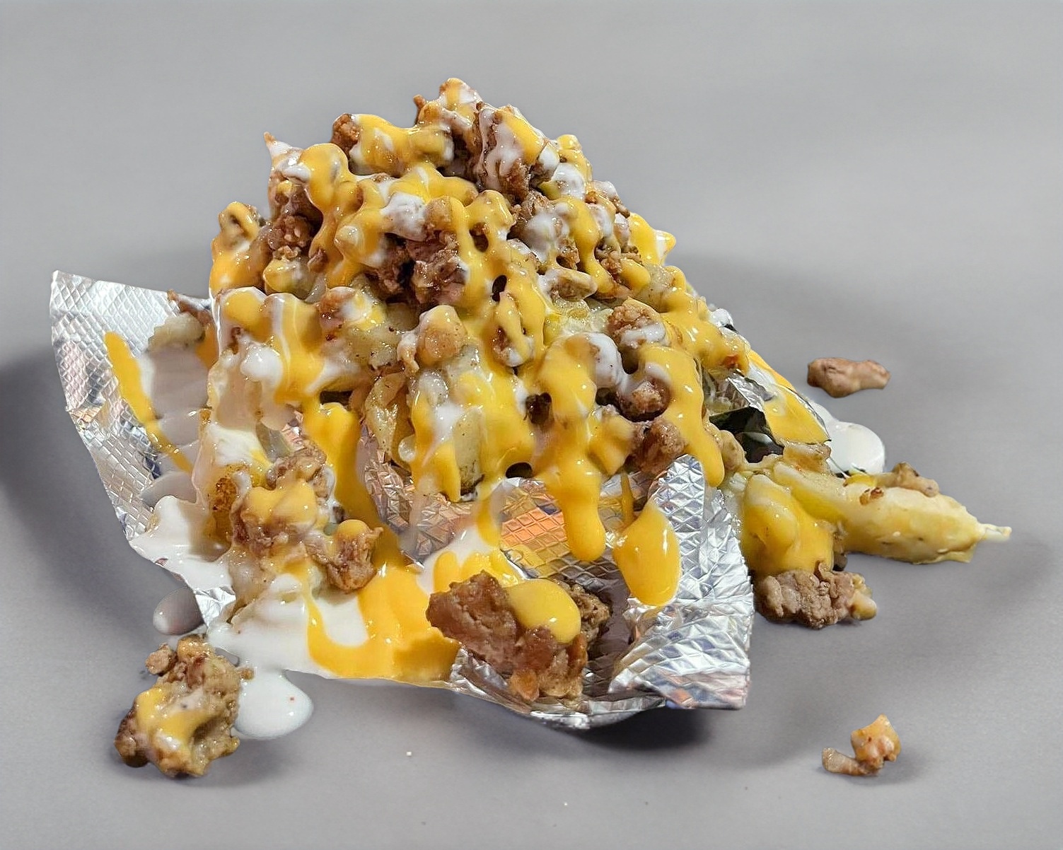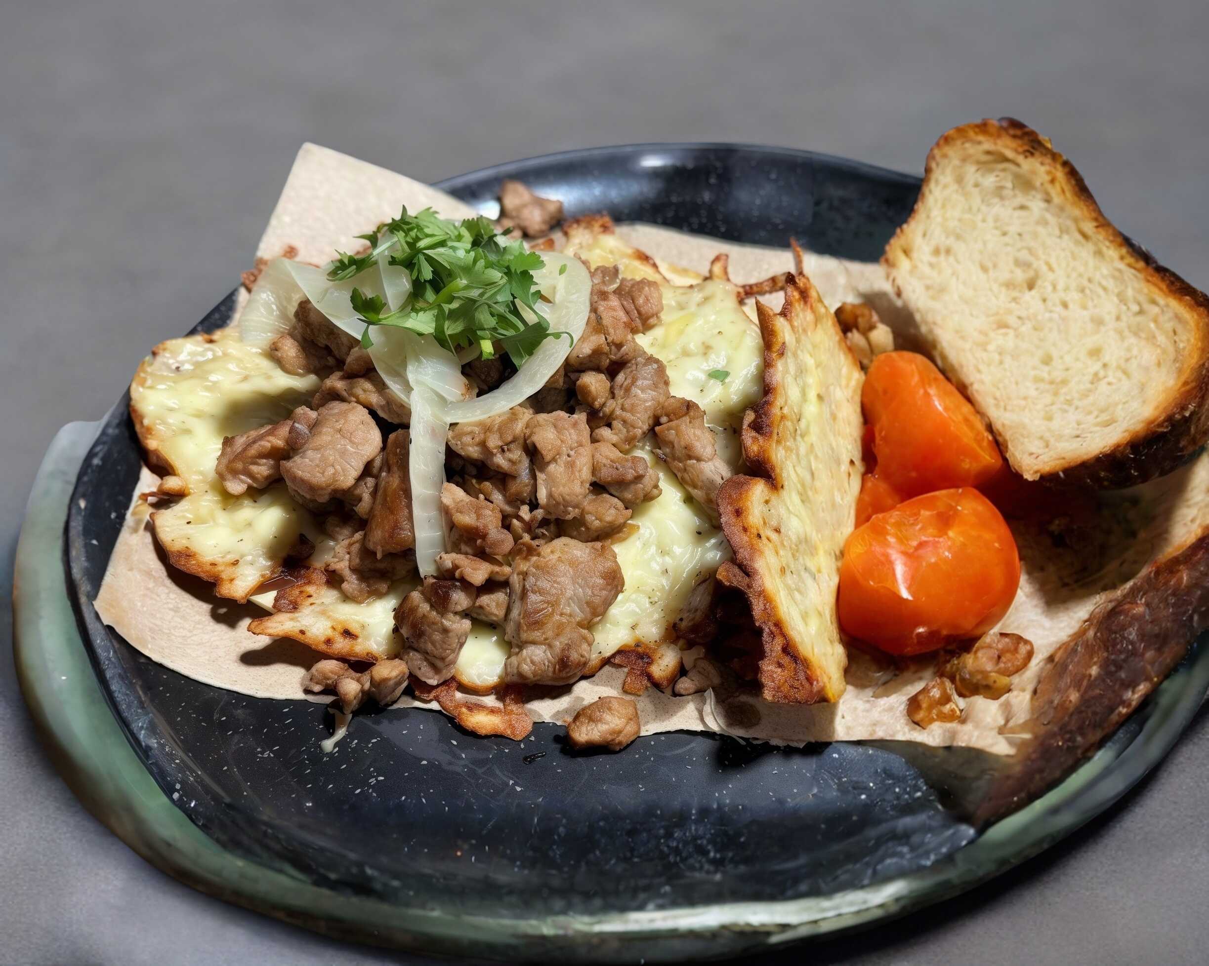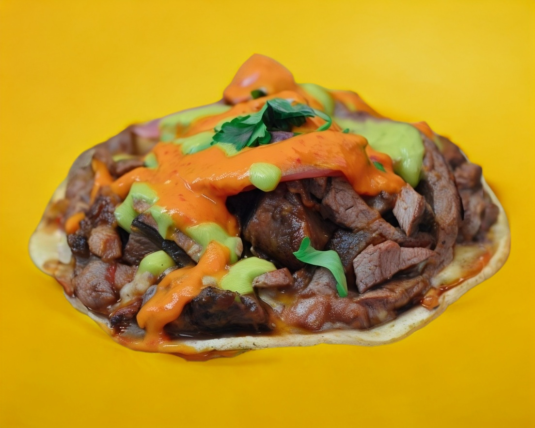 Volcán en tortilla de maíz con rico Sirloin o chicharrón norteño, costra de queso y coronado con cebollitas moradas, incluye salsas verde y roja.