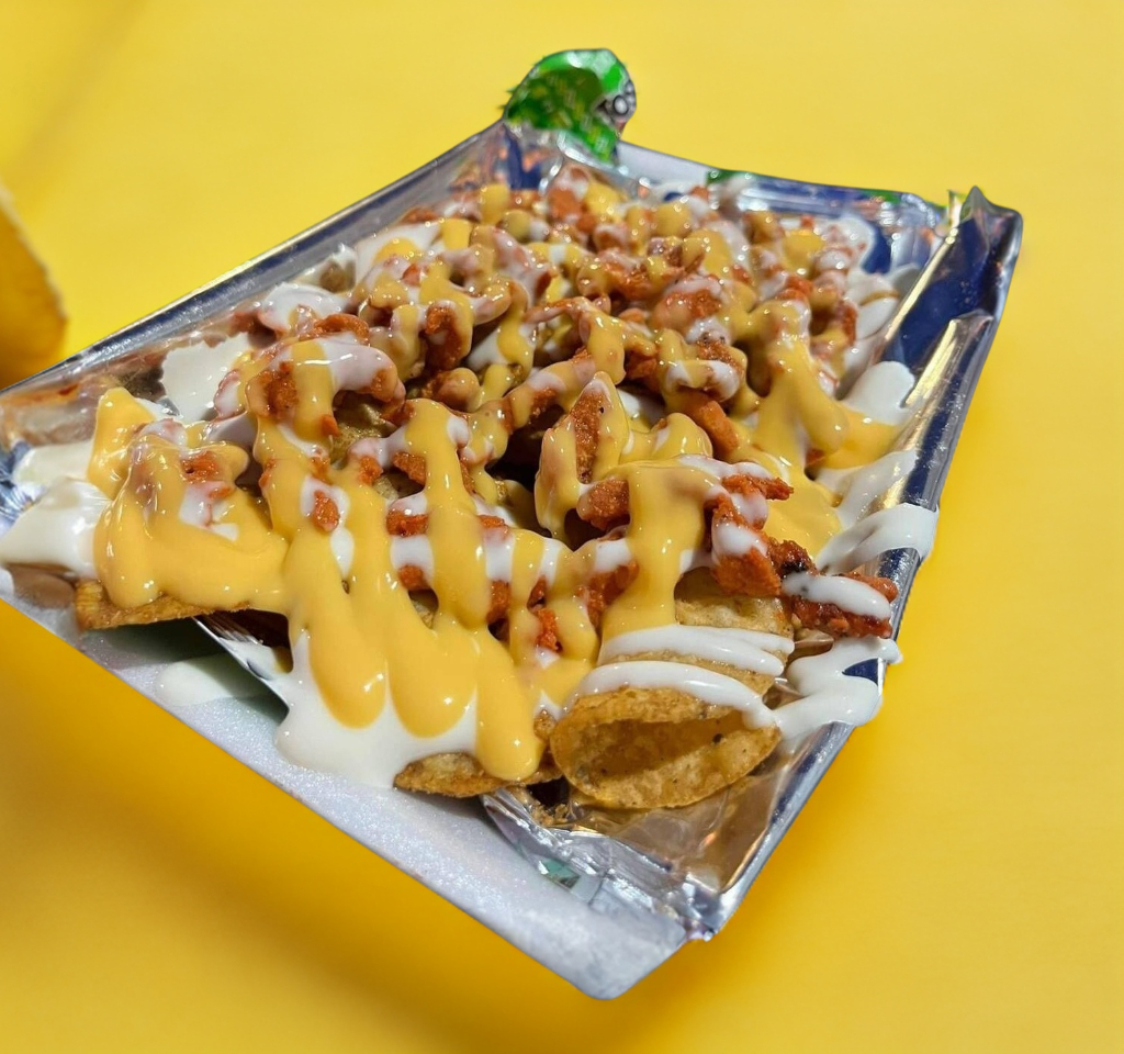 Tostitos Verdes con crema, queso amarillo y rica carne al pastor.