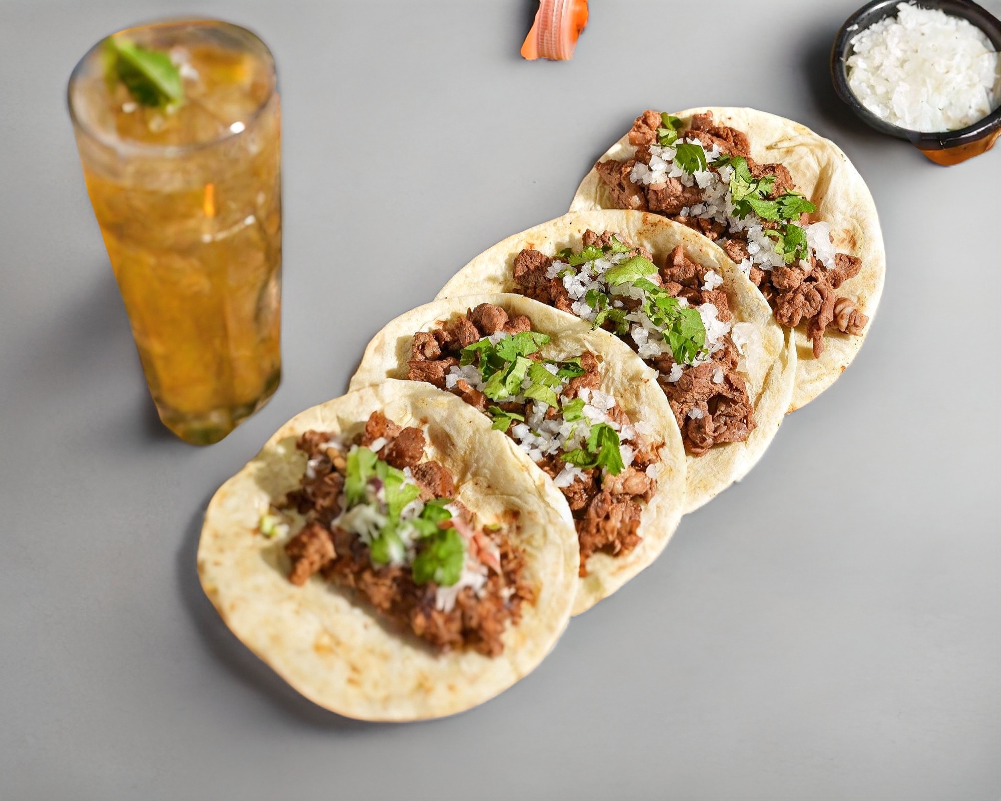 Orden de 4 tacos con deliciosa carne de Sirloin, incluye cilantro, cebolla, limones y salsas verde y roja.