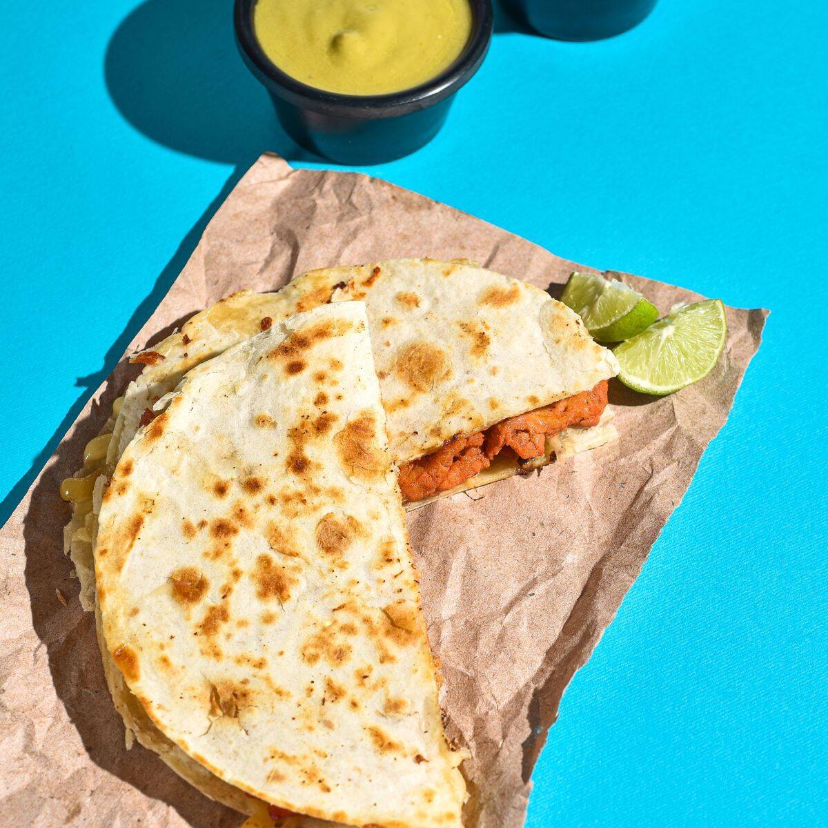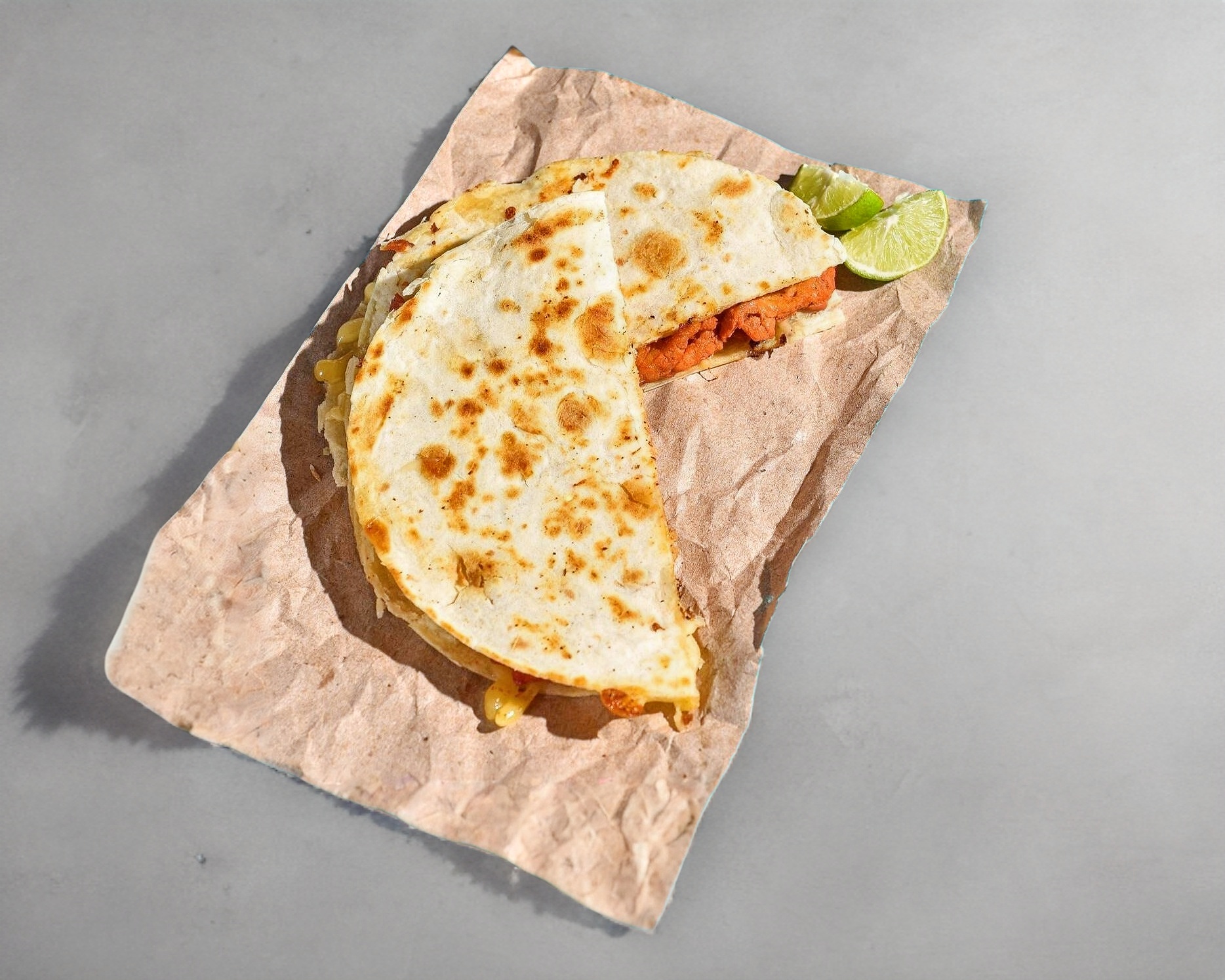 2 tortillas de harina con queso fundido y carne al pastor acompañado de cebolla, cilantro, piña y limones, salsas verde y roja