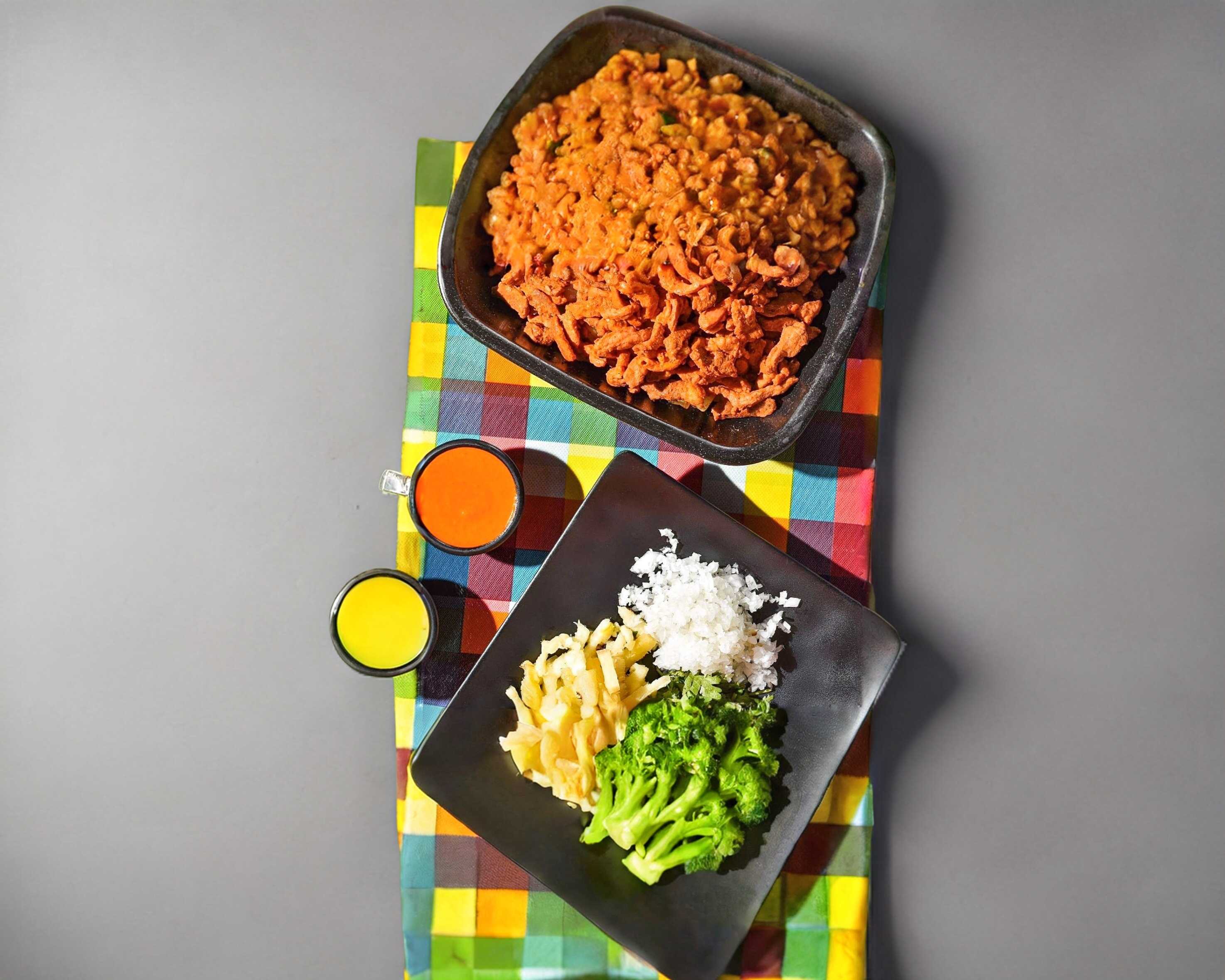 Un kilogramo de sirloin, incluye salsas verde y roja, cebolla, cilantro, limones y tortillas de maíz y harina. Seis ordenes aproximadamente.