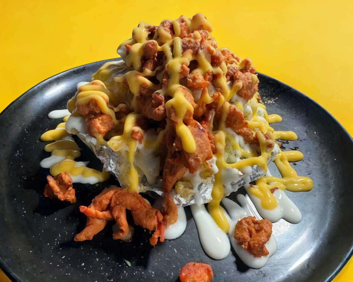 Rica papa asada con mantequilla, crema, queso amarillo y carne al Pastor