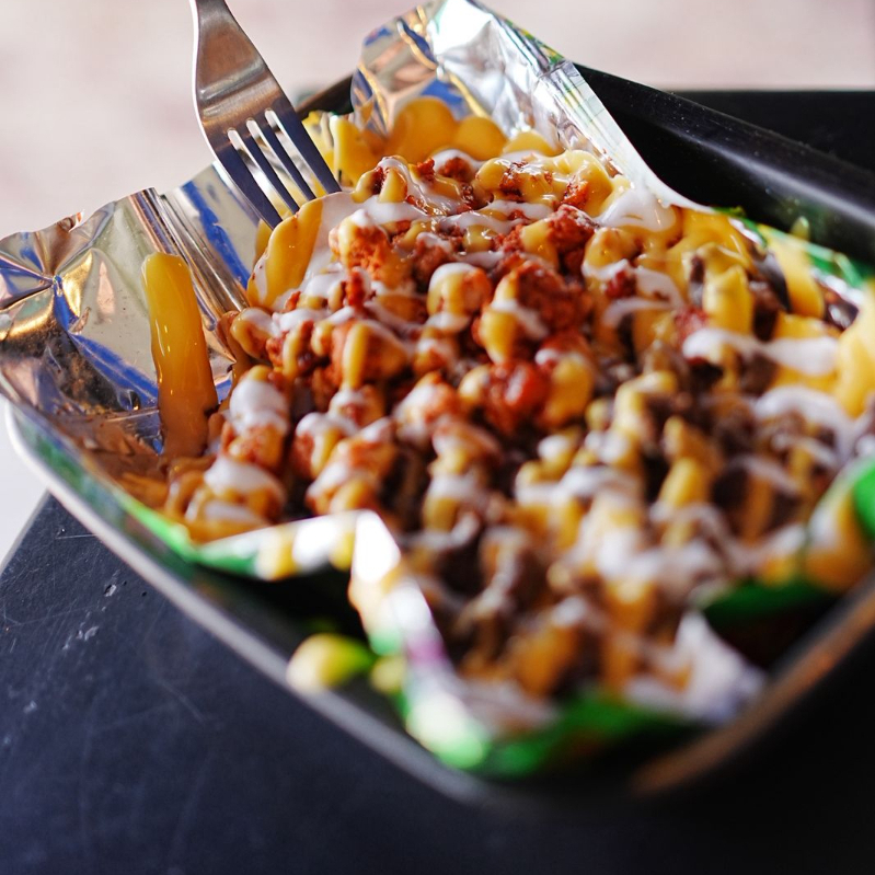 Tostitos Verdes con crema, queso amarillo, elote y rica carne al pastor.