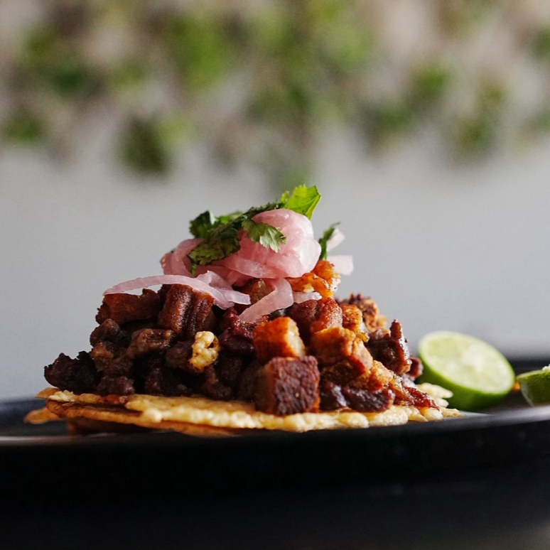 1 kg de sirloin con chicharron de la ramos, incluye salsas verde y roja, cebolla, cilantro, limones y tortillas de maíz y harina. Seis ordenes aproximadamente.
