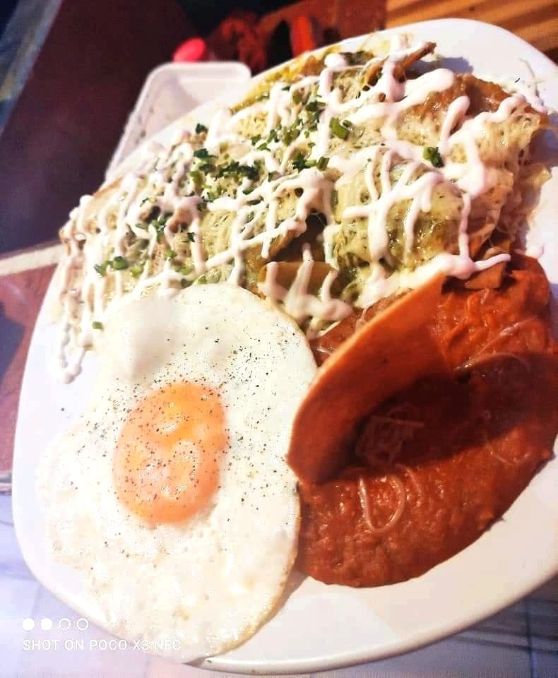 Deliciosos chilaquiles servidos con crema, queso, acompañados de huevito o guiso y frijolitos