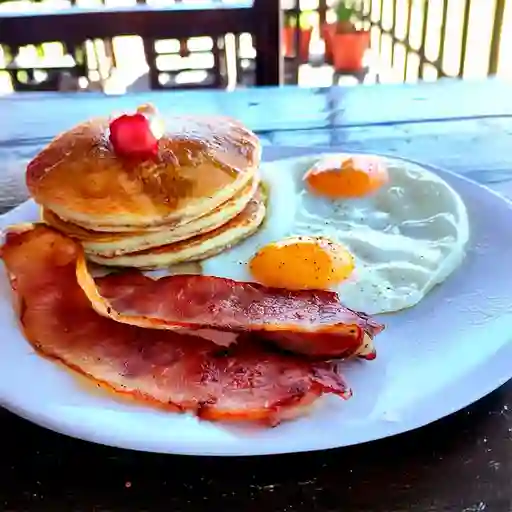 Dos huevos estrellados (recomendación del cheff) acompañados de 2 tiras de tocino, 3 hotcakes con fruta y miel maple
