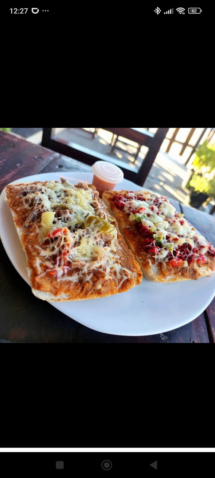 2 Molletes en pan francés (pan completo) con cama de frijoles, chorizo y pico de gallo salteado, queso gratinado y cebolla encurtida