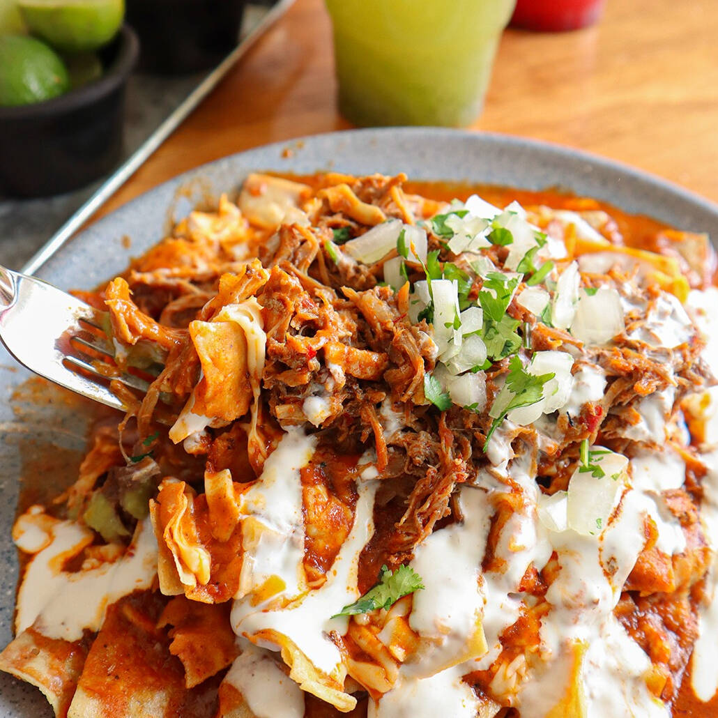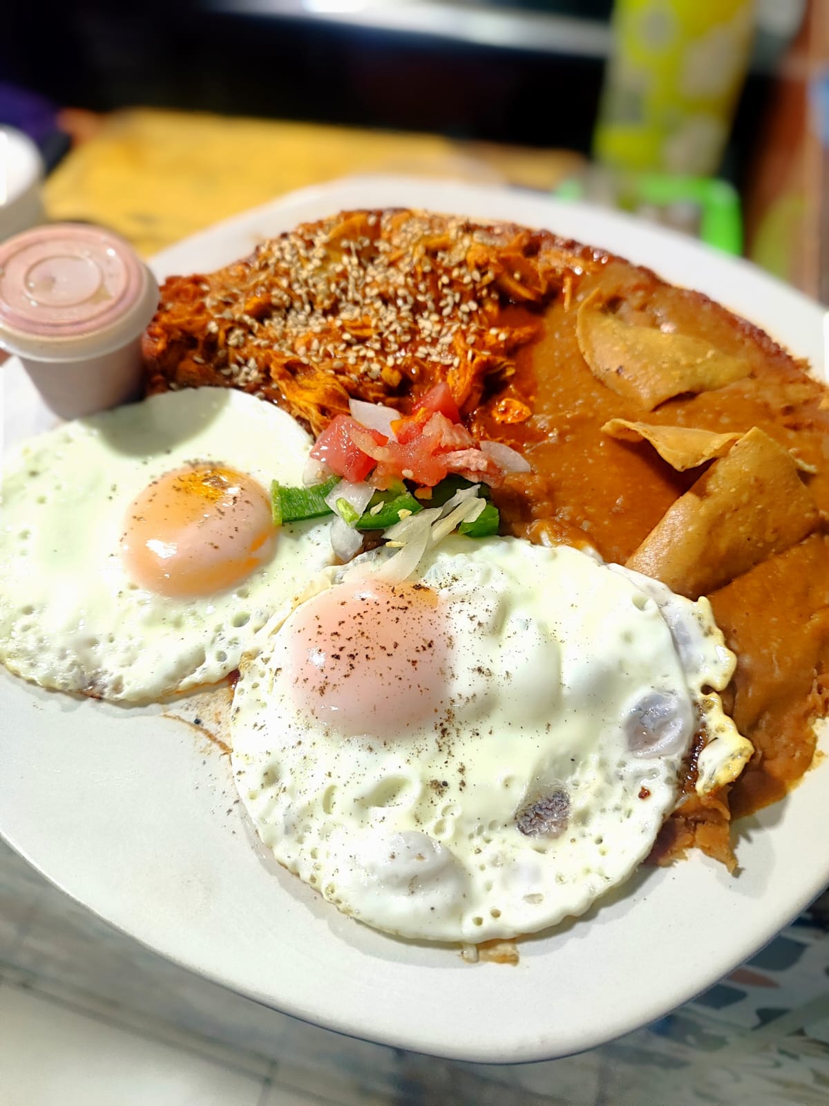 Chilaquiles en salsa de mole estilo Oaxaca coronados con pollo enmolados sobre los chilaquiles, huevo al gusto y frijoles